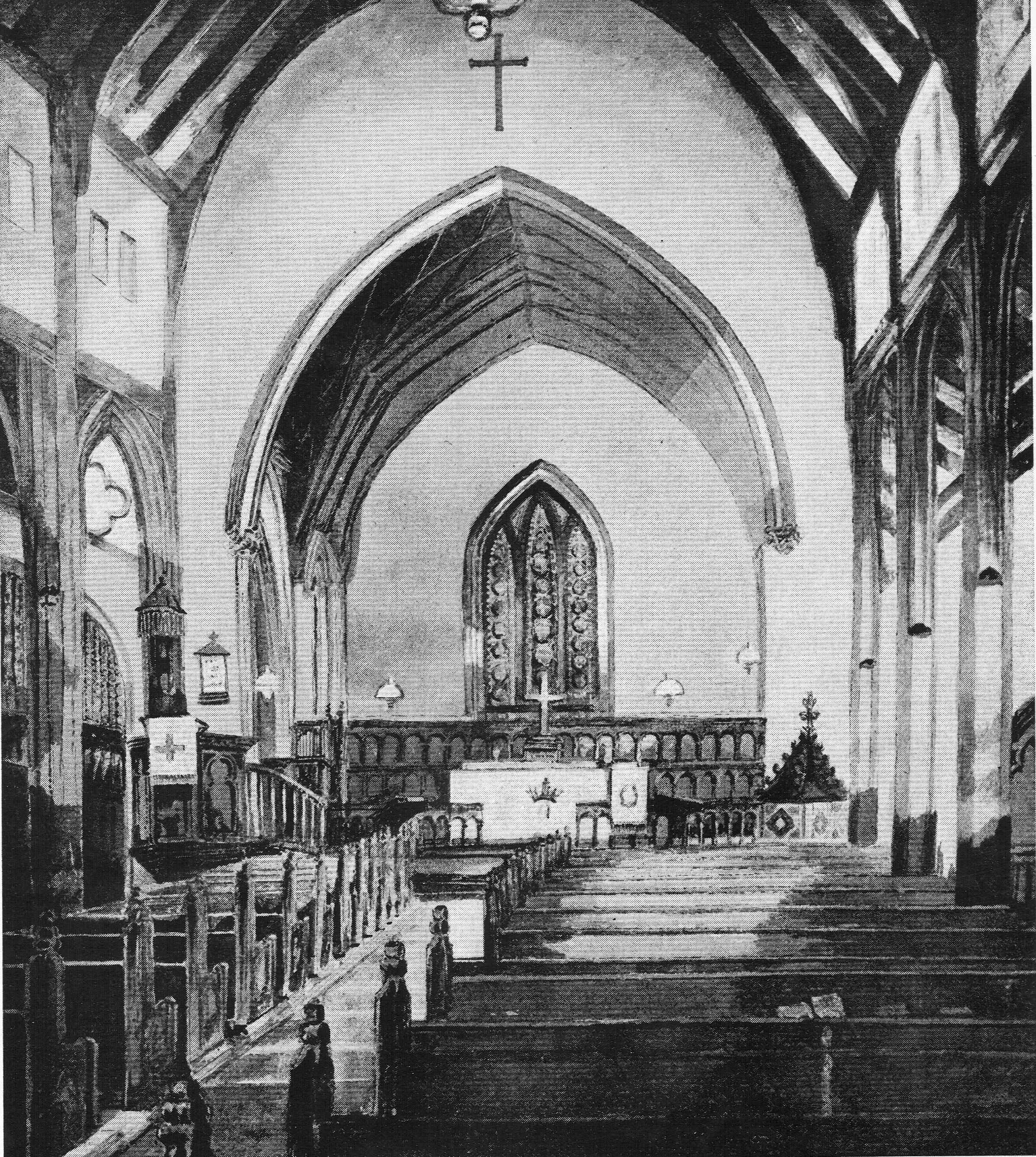 Painting of the interior of St. Stephen's Church, Millburn in the days before electricity. Painting by Thomas J. Capern, 1915 depicting the church prior to 1898. Location of painting unknown.Reproductions