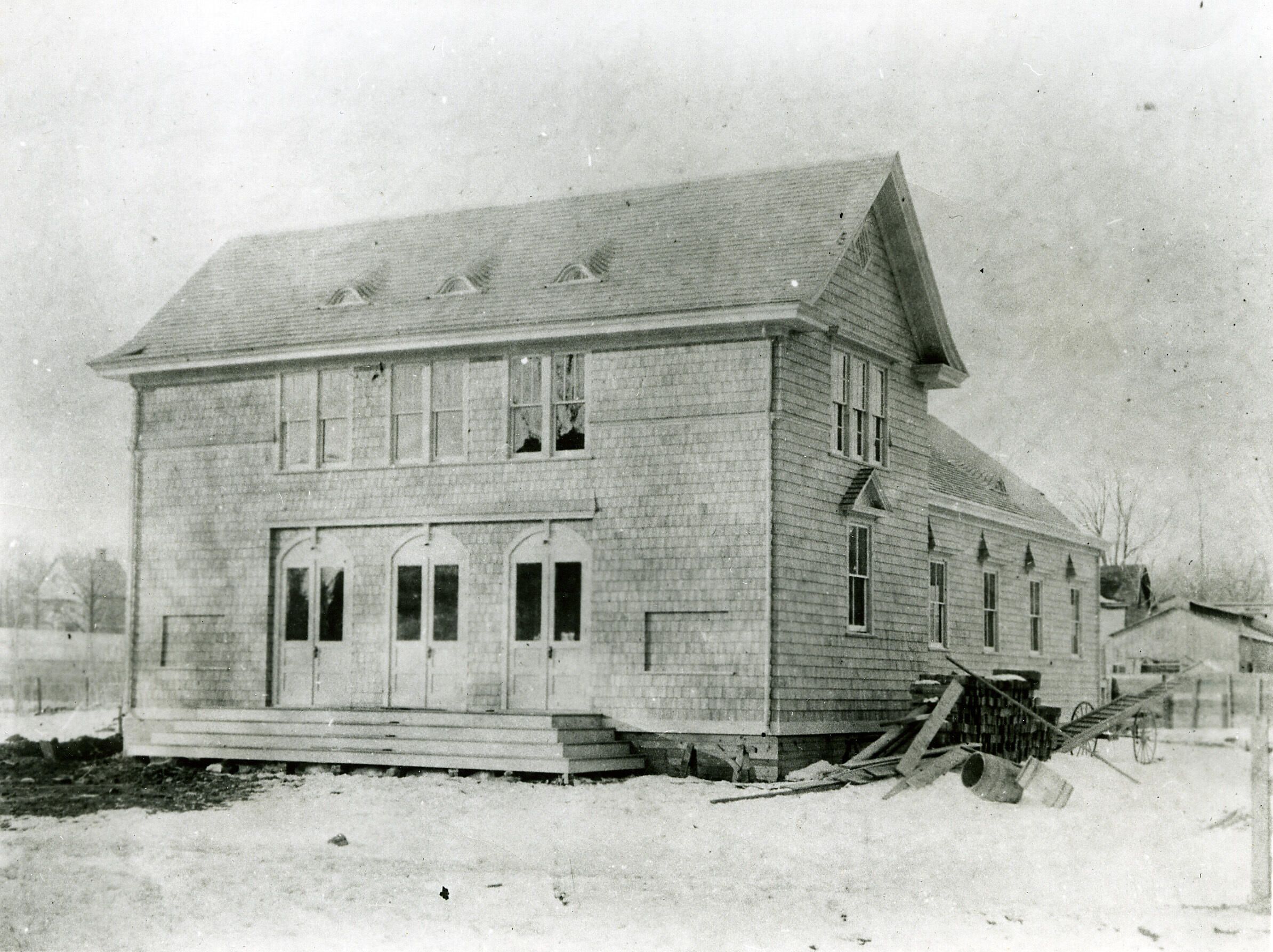 This originally stood on the north side of Church Street on the rear of the property owned by the Neighborhood Association of Millburn (Now the Community Garden). It was built by the Men's Club of the church. It is now on the opposite side of the street, attached to the rear of the church. Moving the building was a town project. Reverend Watson was minister.Photograph Details
