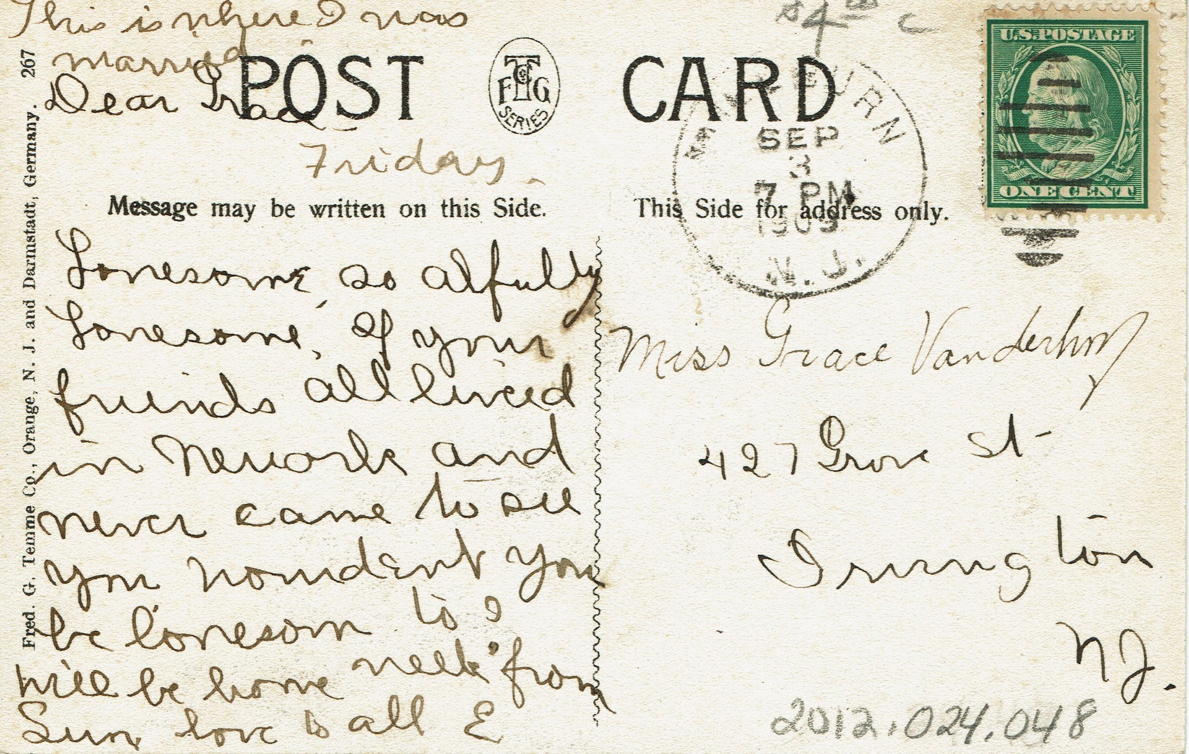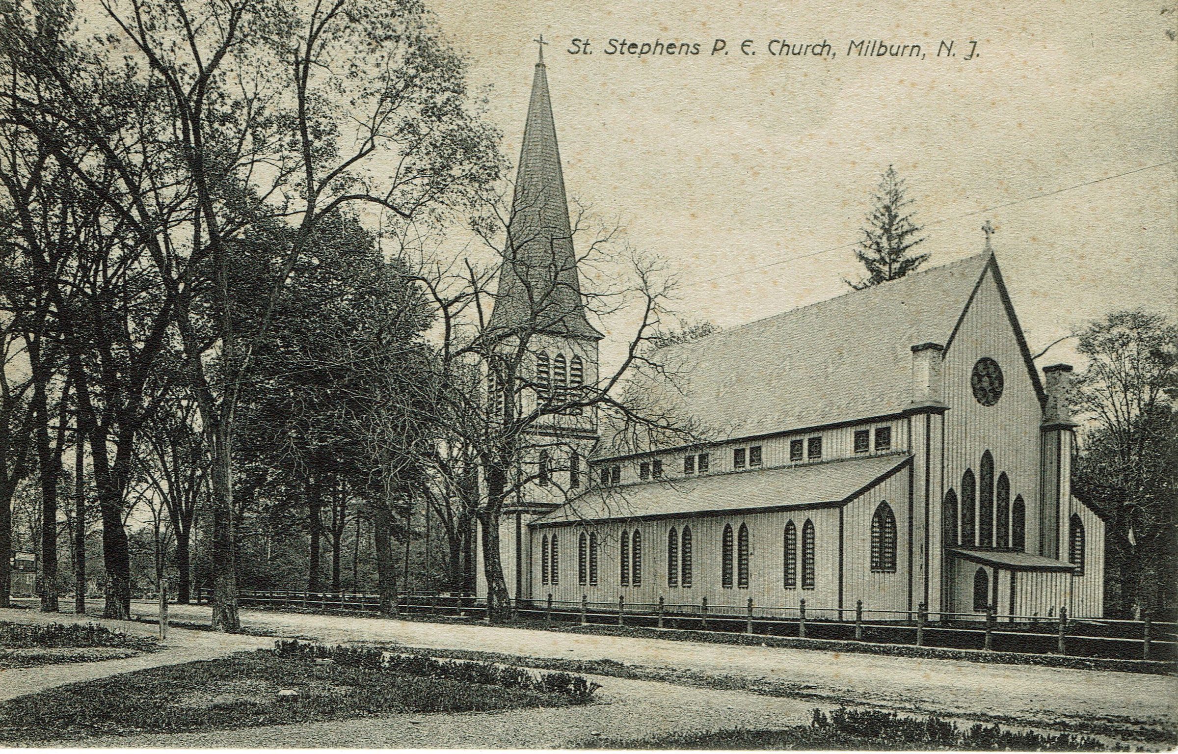 Popular photographic postcard of St. Stephen's Church, Main and Church Streets, Millburn. Postally used, postmarked Millburn, September 3, 1909, 7:00 pm. Addressed to Miss Grace Vanderhof, 427 Grove Street, Irvington, NJ.Collection