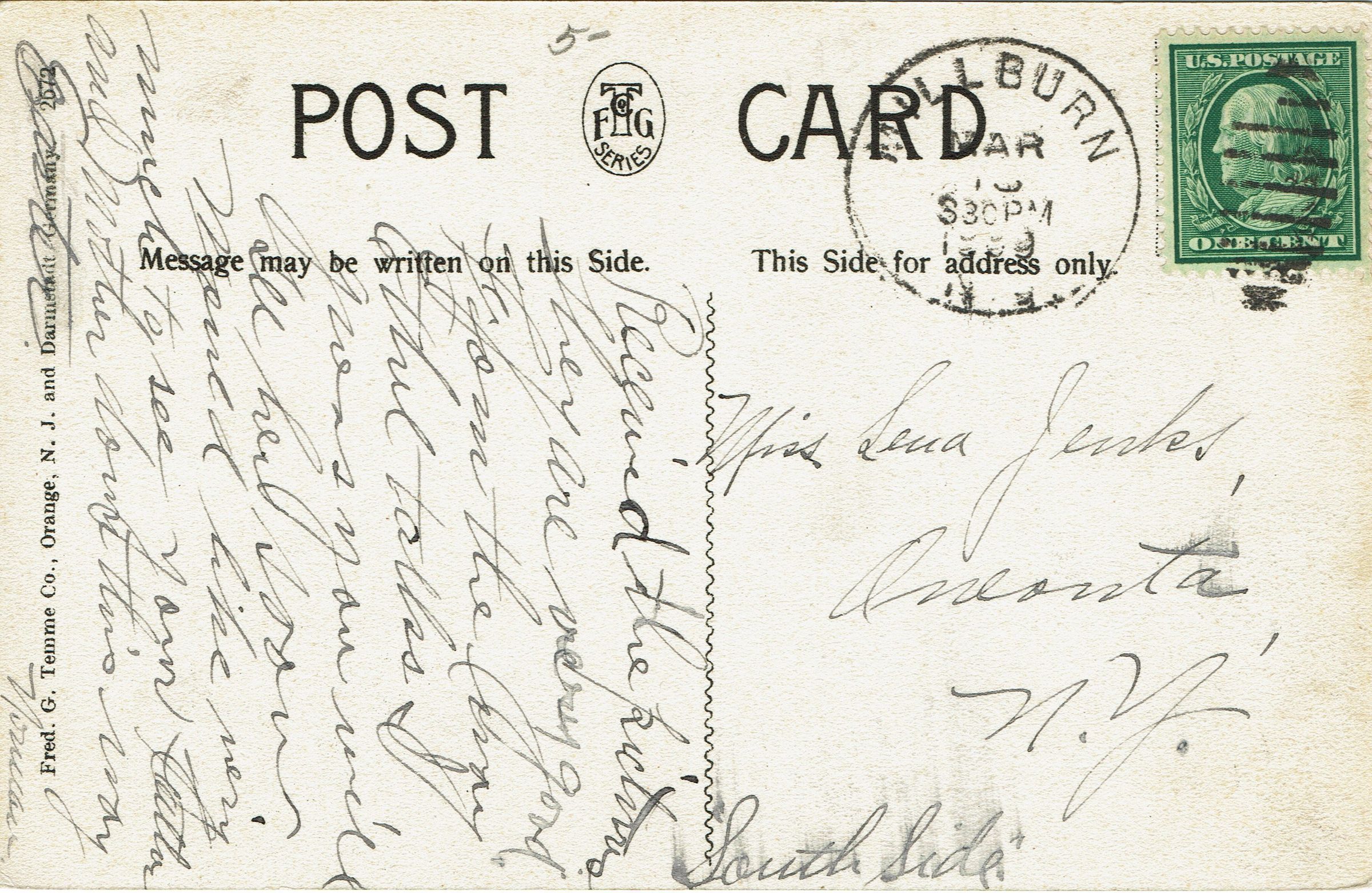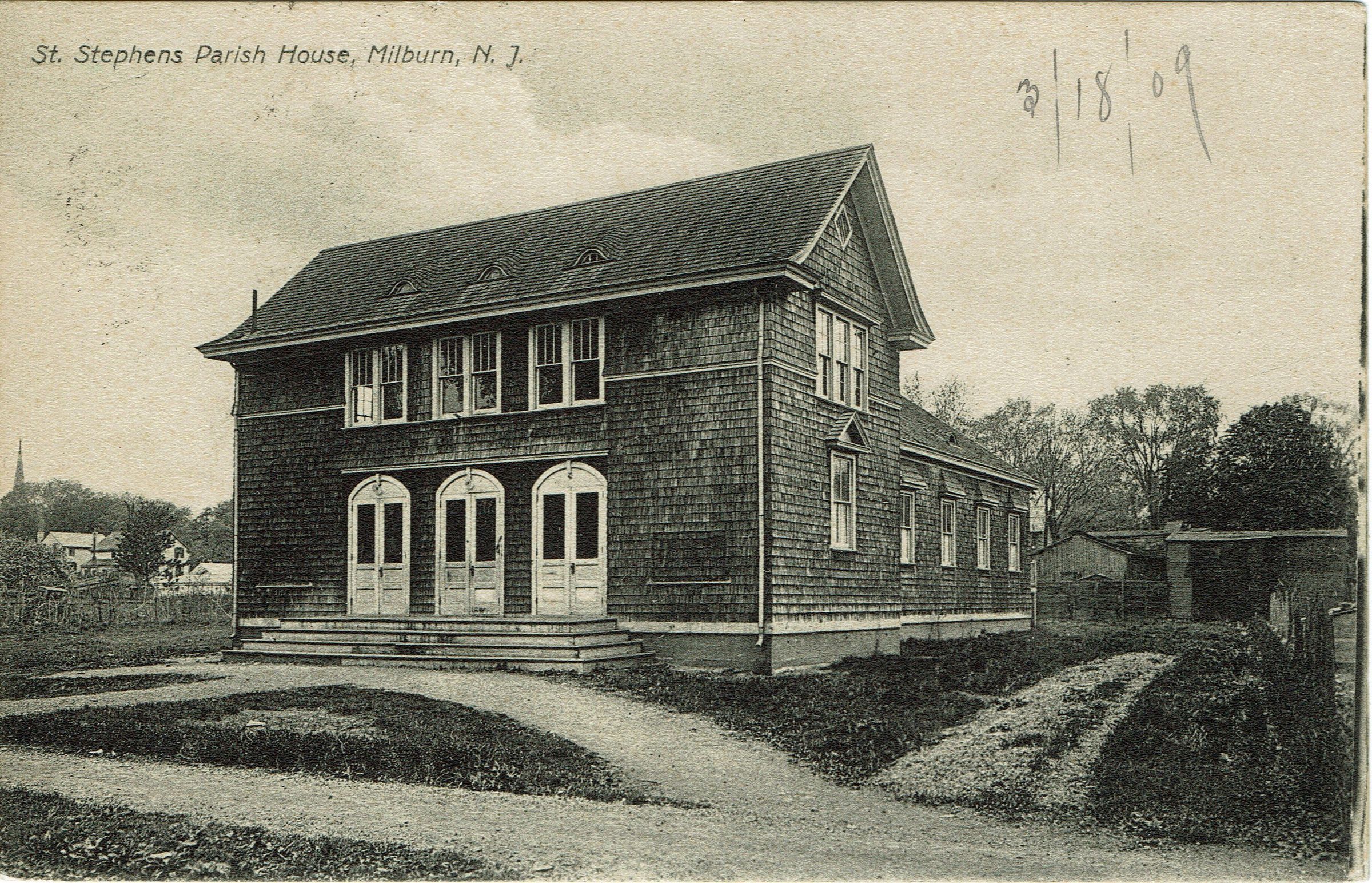 Photographic postcard of St. Stephen's Parish House, Millburn. Postally used, postmarked Millburn, March (date unclear) 3:30 pm. Front of postcard contains date: March 18, 1909. Addressed to Miss Lena Jenks, Oneonta, N.Y. South Side.