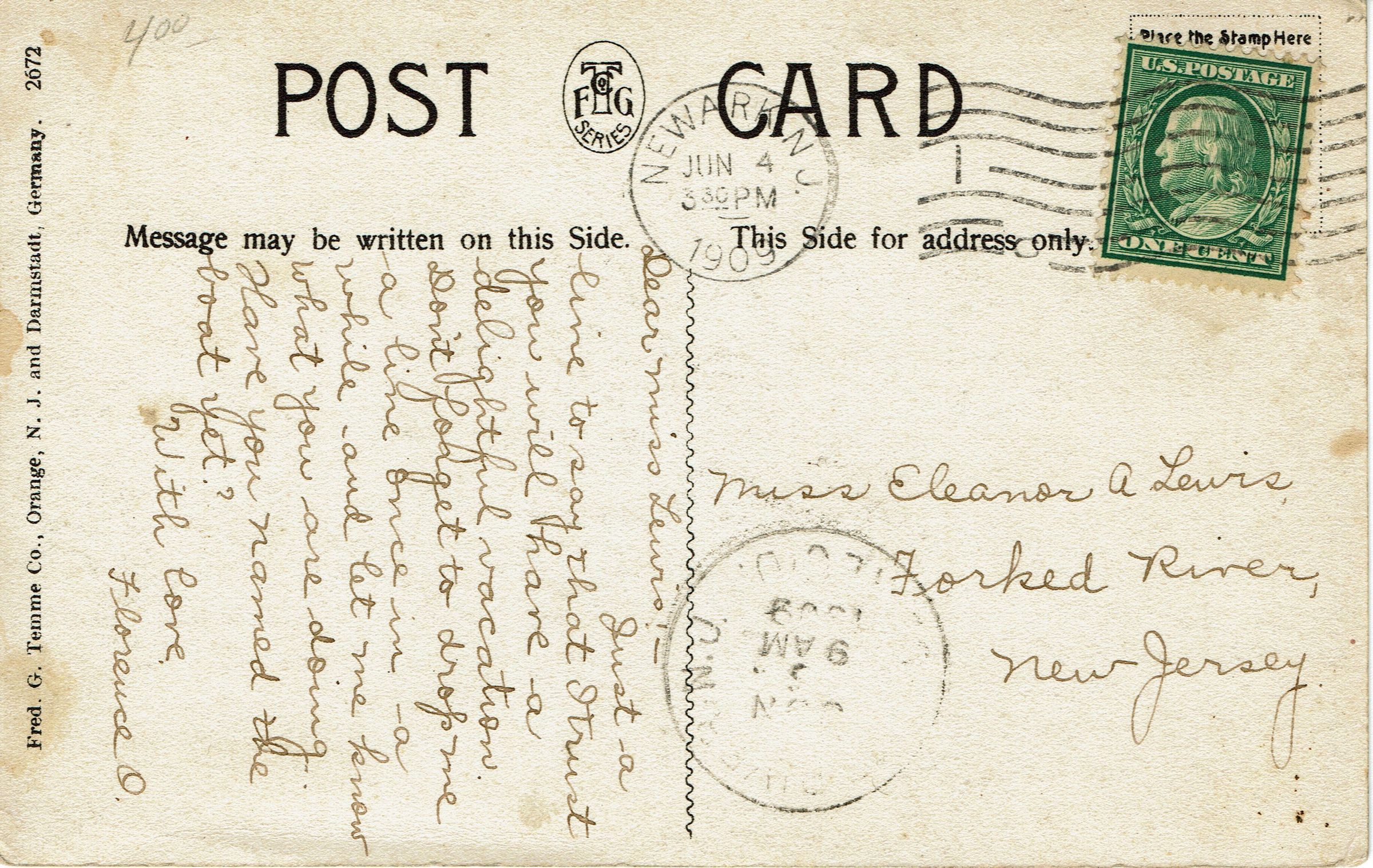 Photographic postcard of St. Stephen's Parish House. Postally used, postmarked Newark, NJ June 4, 1909, 3:30 pm, received Forked River, NJ, June 5, 1909, 9:00 am. Postcard is addressed to Miss Eleanor A. Lewis, Forked River, New Jersey.