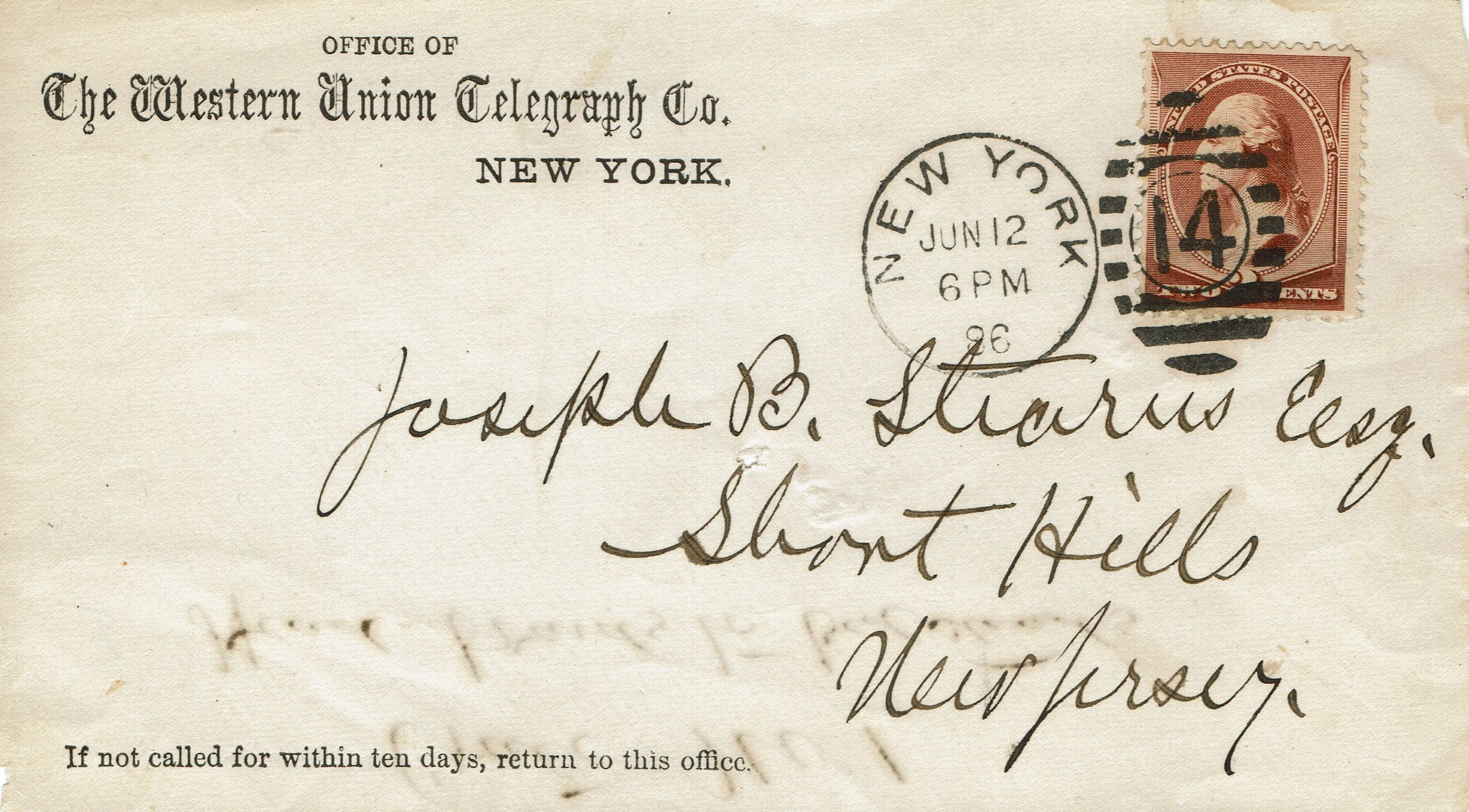Envelope from the Office of the Western Union Telegraph Company to Joseph B. Stearns, Esq., Short Hills, New Jersey postmarked New York, June 12, 1896, 6:00 pm. Verso of envelope reads Crate No. 1, 3 Head-Boards to bedstands.Acquisition