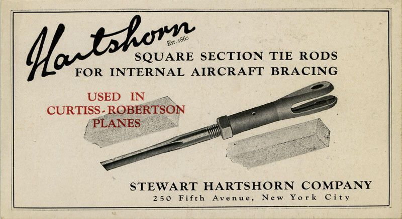 Unused advertising ink blotter from the Stewart Hartshorn Company, for aircraft tie rods. The front of the card advertises: "Square Section Tie Rods For Internal Aircraft Bracing; Used in Curtiss-Robertson Planes; Stewart Hartshorn Company; 250 Fifth Avenue, New York City. The front of the card is clean and undamaged. Purchased on eBay from: Kit Barry Ephemera; 74 Cotton Mill Hill #A252; Brattleboro VT 05301; kbarry@surfglobal.net; 802-380-5611Acquisition