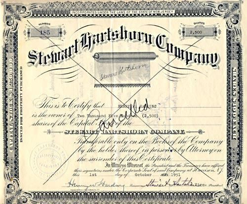 Cancelled stock certificate #185 for 2,500 shares of Stewart Hartshorn Company, issued to Henry W. Harding. (Staple?) Pindot holes in left upper and lower corners. Large black-ink X on face of certificate, with "Cancelled" handwritten across the center. Tiny red check mark in upper right corner.Acquisition