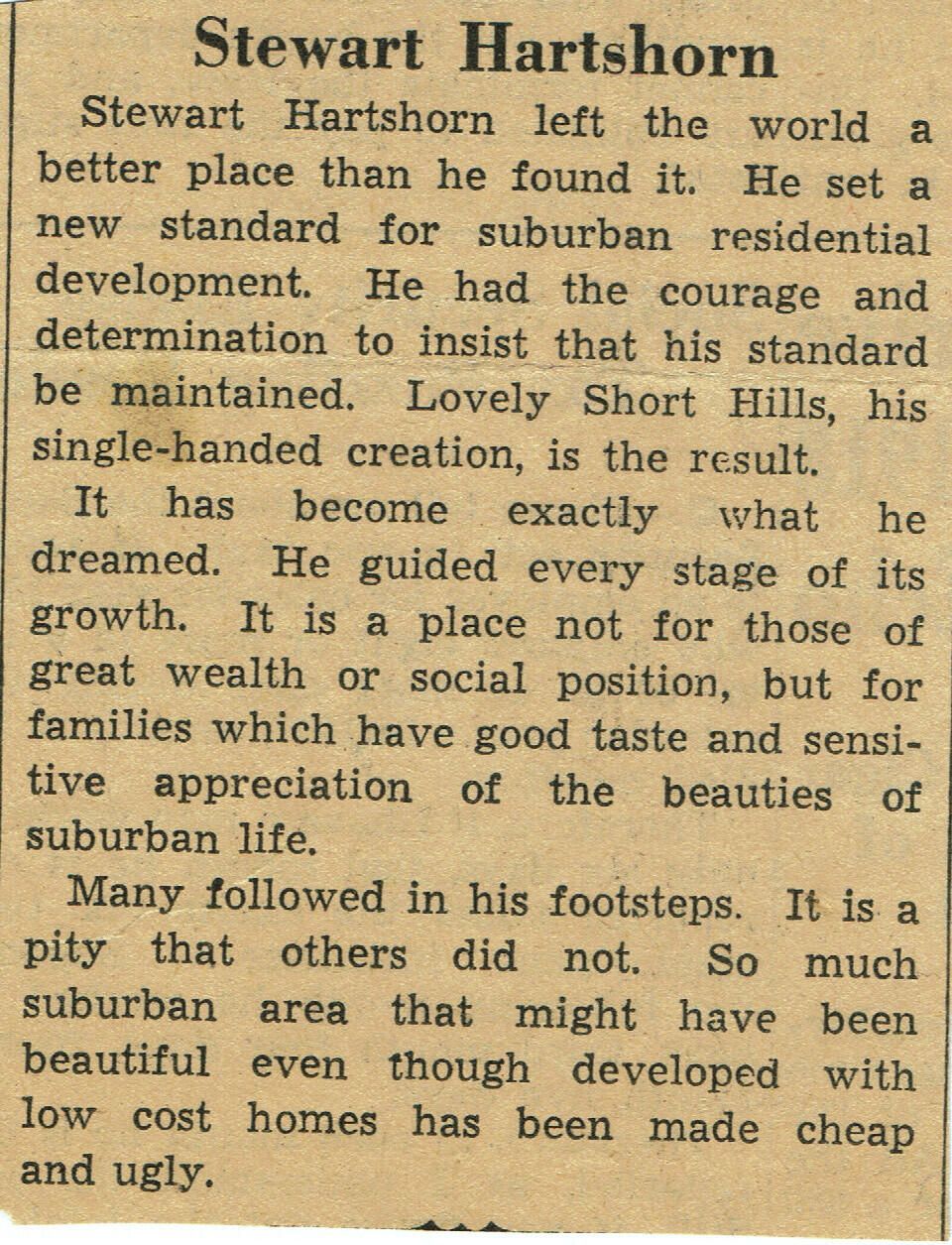 Tribute to Stewart Walker Hartshorn. Date and source, unknown. Part of large collection of newspaper clippings and obituaries from the Hartshorn Family.Collection