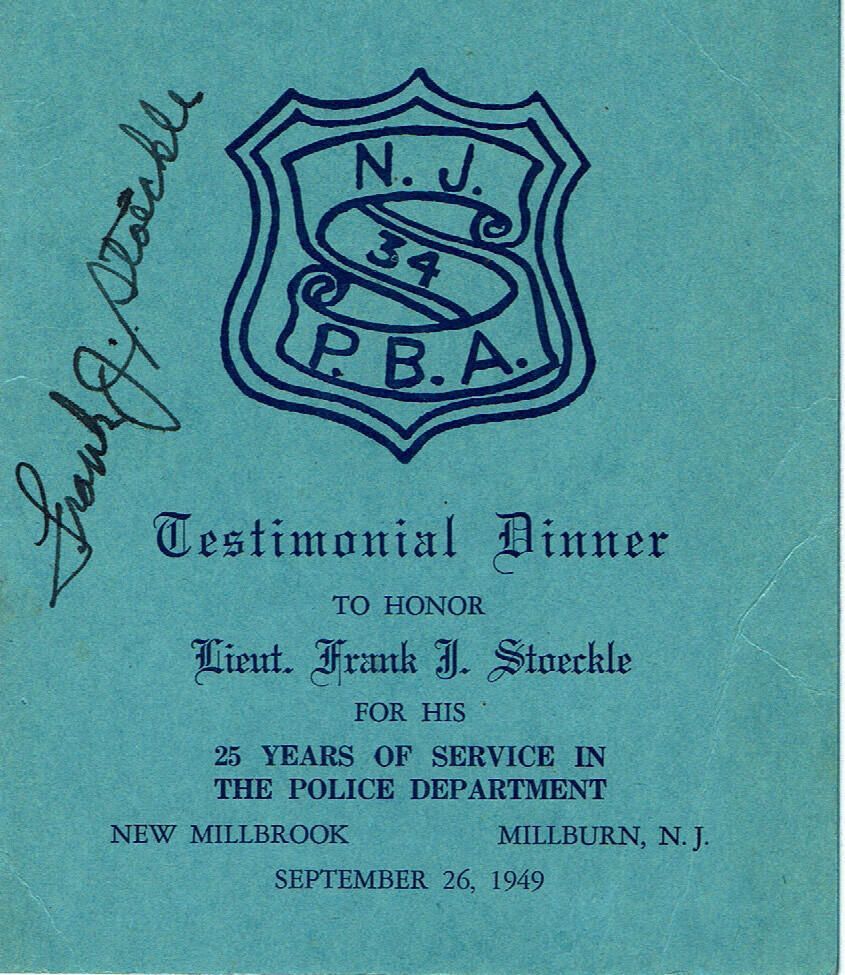 Program for the Testimonial Dinner to honor Lieutenant Frank J. Stockle of the Millburn Police Department for his 25 years of service on September 26, 1949 at the New Millbrook. 4 pp. Signed by Frank J. Stockle on front cover.Acquisition