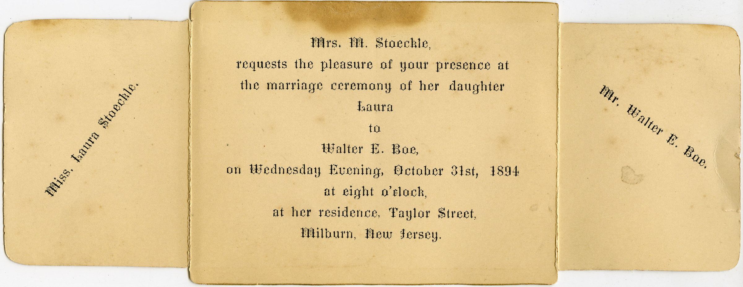 Wedding Invitation from Mrs. M.Stoeckle to the marriage of her daughter Miss Laura Stoeckle to Walter E. Boe on October 31, 1894 at the Stoeckle residence on Taylor Street in Millburn.Acquisition