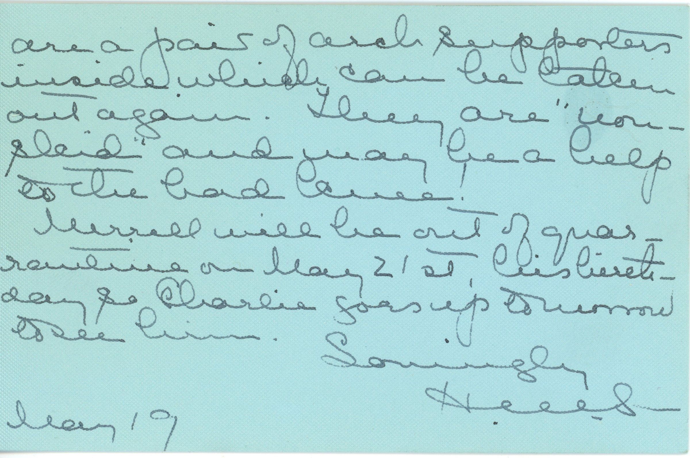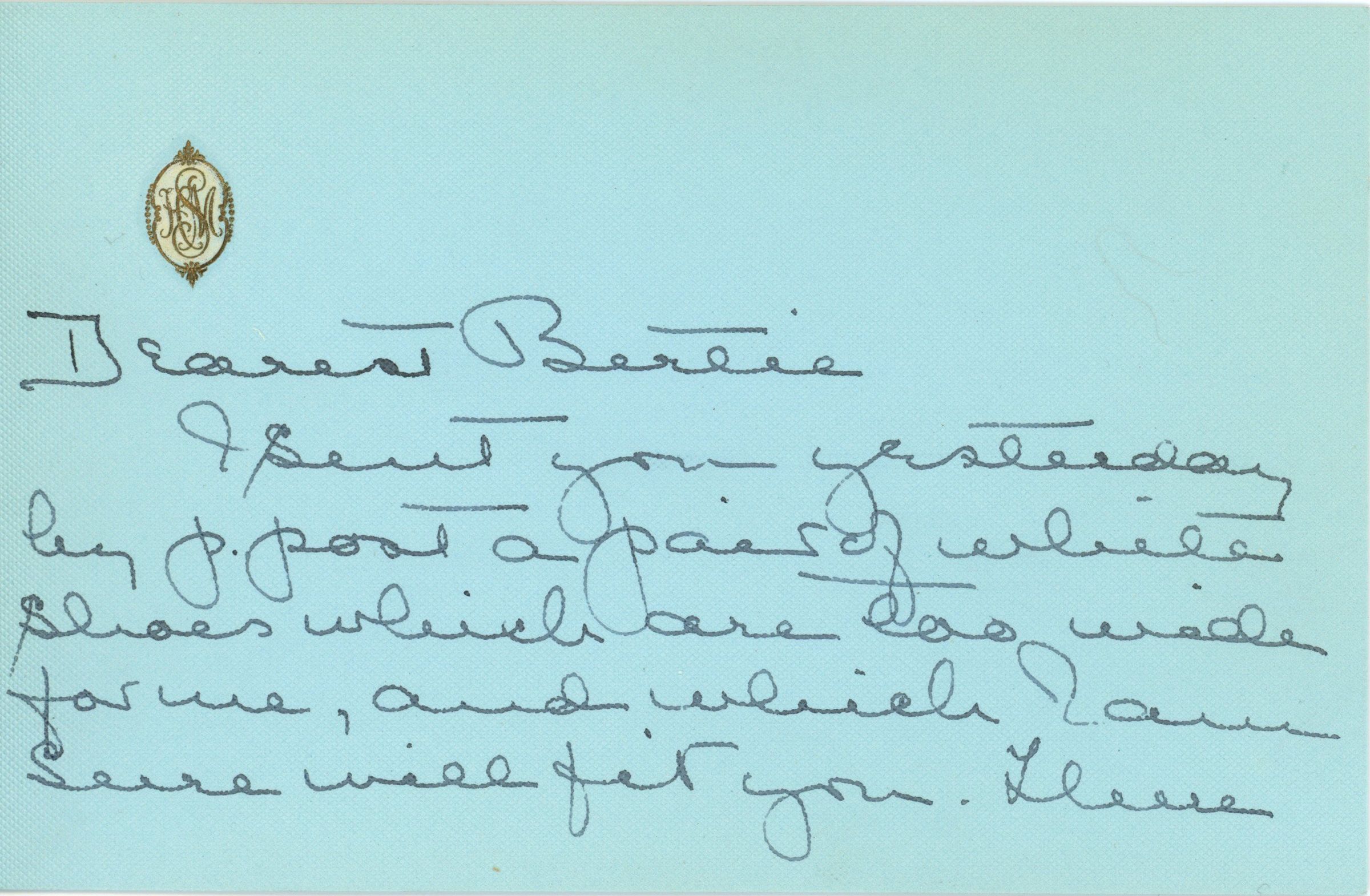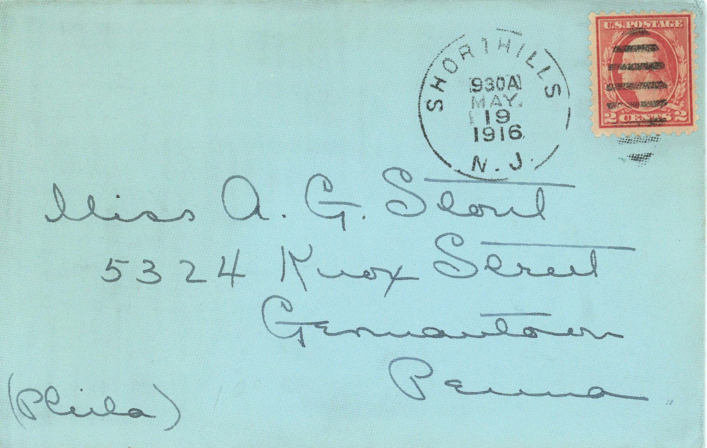Two-page handwritten letter and envelope from Henrietta Stout to Miss A.G.Stout 5324 Knox Street, Germantown, Pennsylvania (Philadelphi) postmarked Short Hills, May 19, 1916, 9:30 am.Acquisition