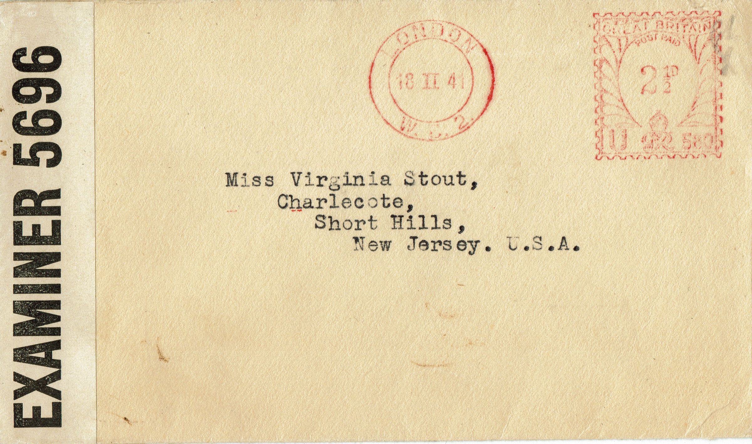 Postally used envelope addressed to Miss Virginia Stout, Charlecote, Short Hills, New Jersey, U.S. A. postmarked London, February 18, 1941 W.W.2. Envelope has the words "Opened By Examiner 5696" along the left side.Acquisition
