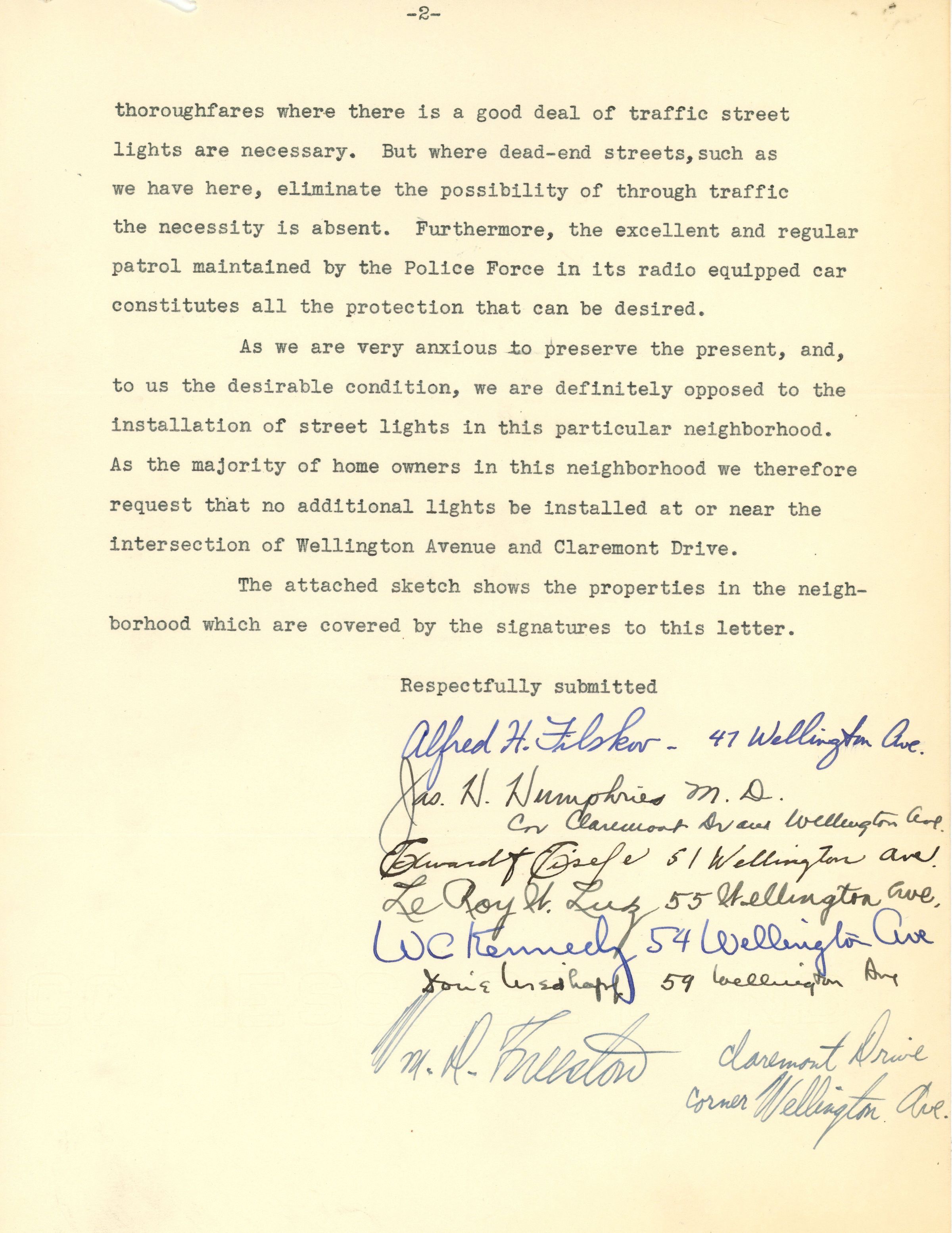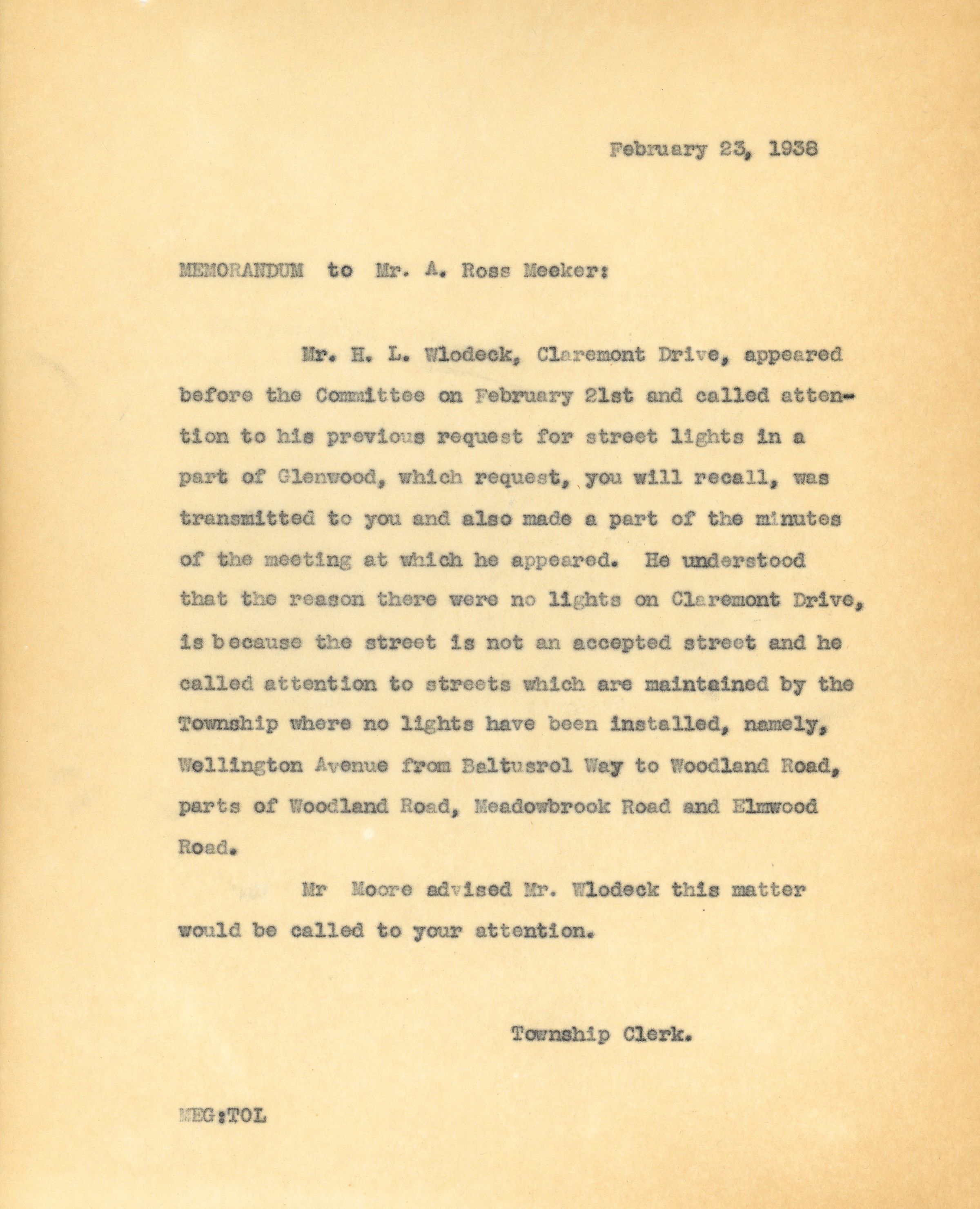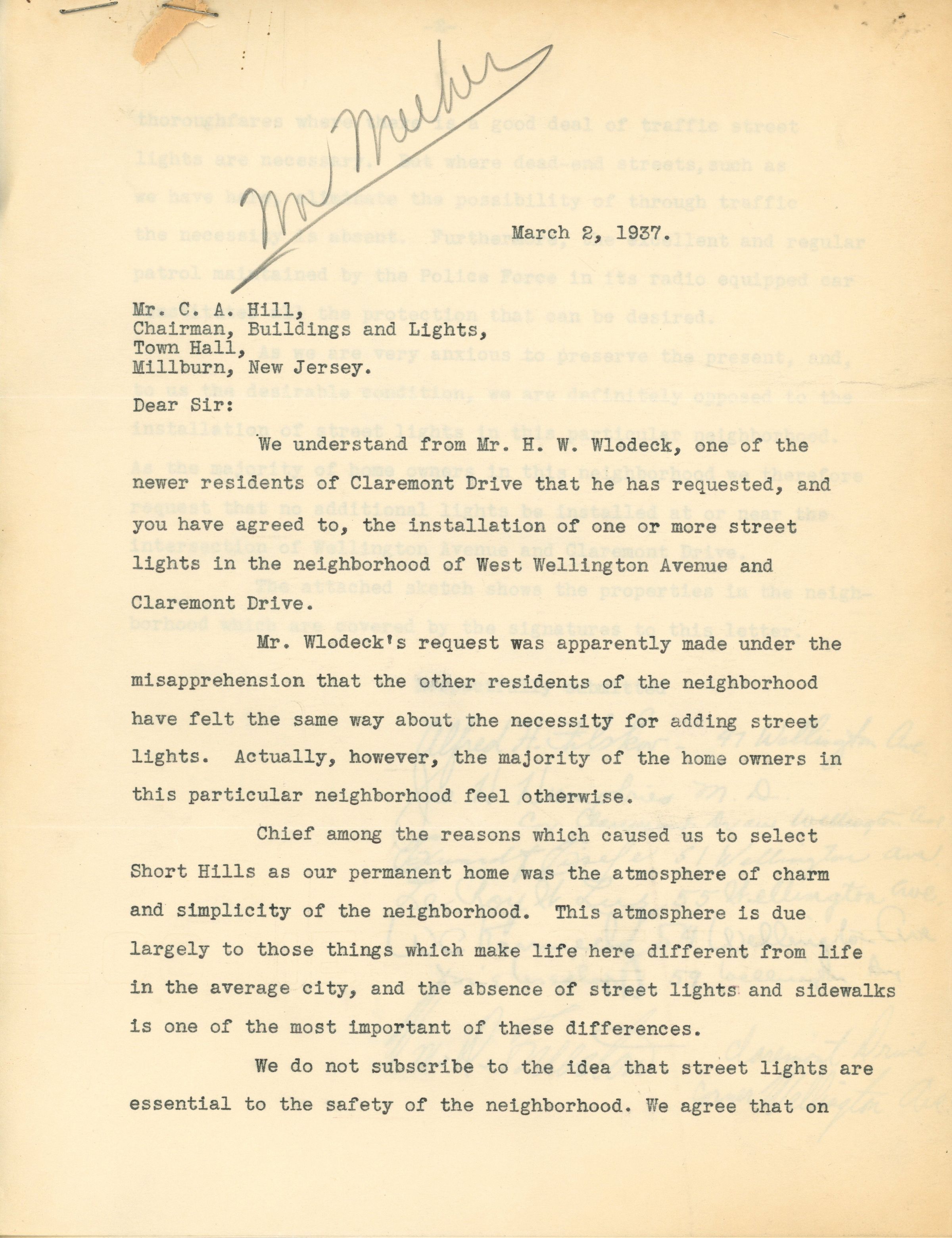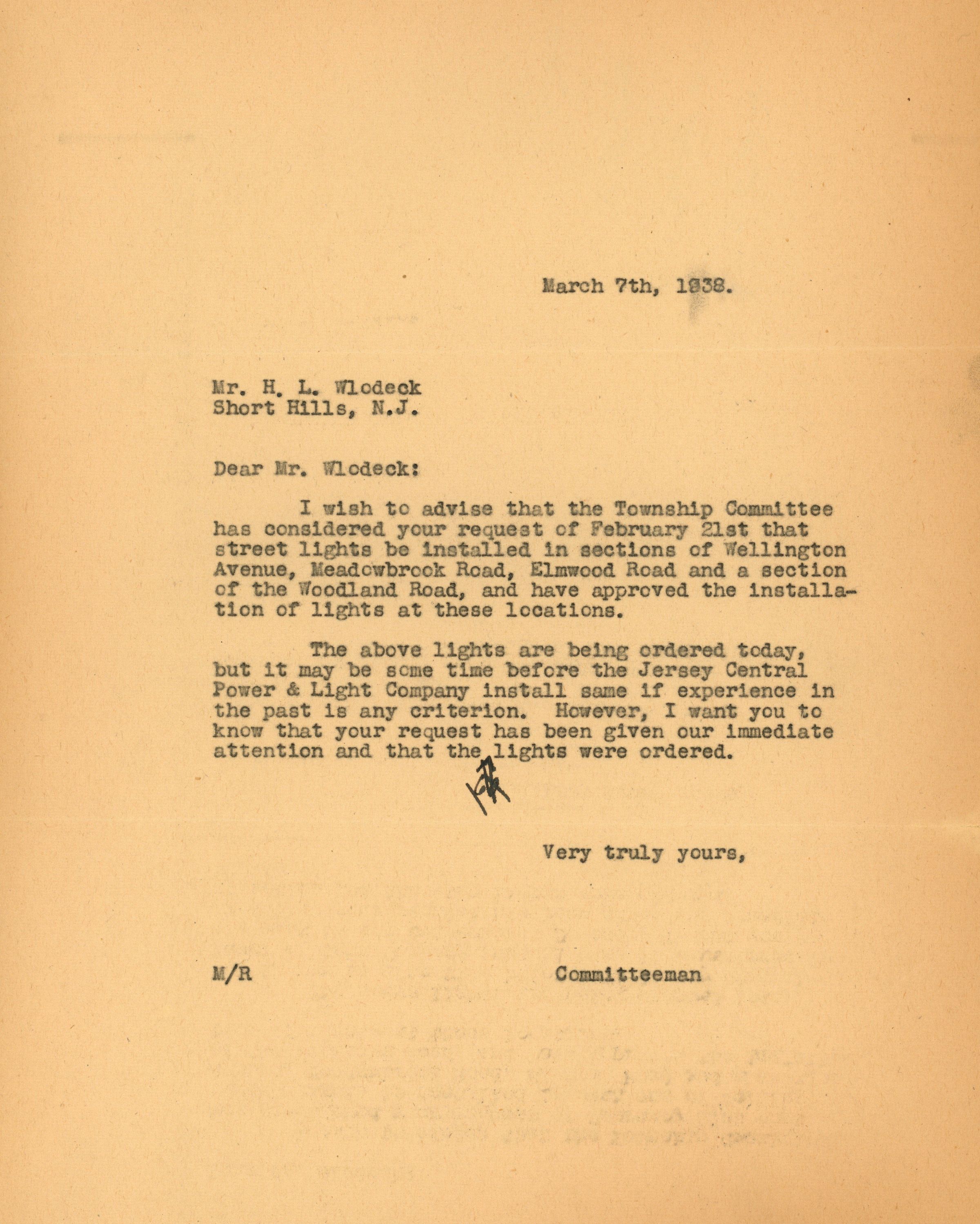 Correspondence between H.L. Wlodeck, A. Ross Meeker, Clarence Hill and residents of Wellington Avenue and Claremont Drive in Short Hills regarding the installation of street lights. Includes a petition dated March 2, 1937 signed by 7 residents of the area objecting to the installation of street lights on the basis that they would interfere with the atmosphere of charm and simplicity of the neighborhood. A typewritten letter dated March 7, 1938 informs H.L. Wlodeck that the Millburn Township Committee has approved his request and the lights have been ordered.Acquisition