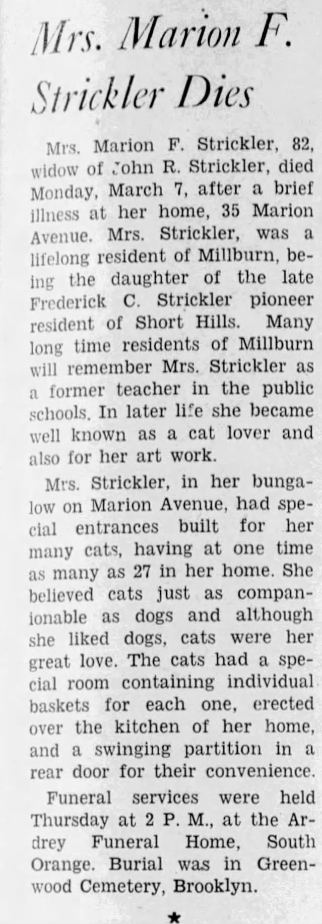 Marion F. Stricker (1866-1938) was the daughter of Frederick C. Farley, who was an early landowner and dairy farmer in Millburn. She was a school teacher in Millburn and also an artist.Acquisition