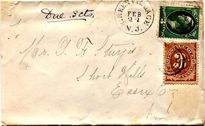 Empty envelope postmarked "Green Village; Feb 22 1882" and addressed to "Mr. G. (?) F. Sturgis; Short Hills, Essex Co; NJ" Front of envelope has two three-cent cancelled stamps and is marked in ink "Due 3 cts." Envelope is now stuck/sealed shut. It has ghost images of three stamps, on the back, two cancellations on the back, and an ink circle with a white cross , or T-shape, in the middle. Envelope has minor edge wear and light overall smudges.Acquisition