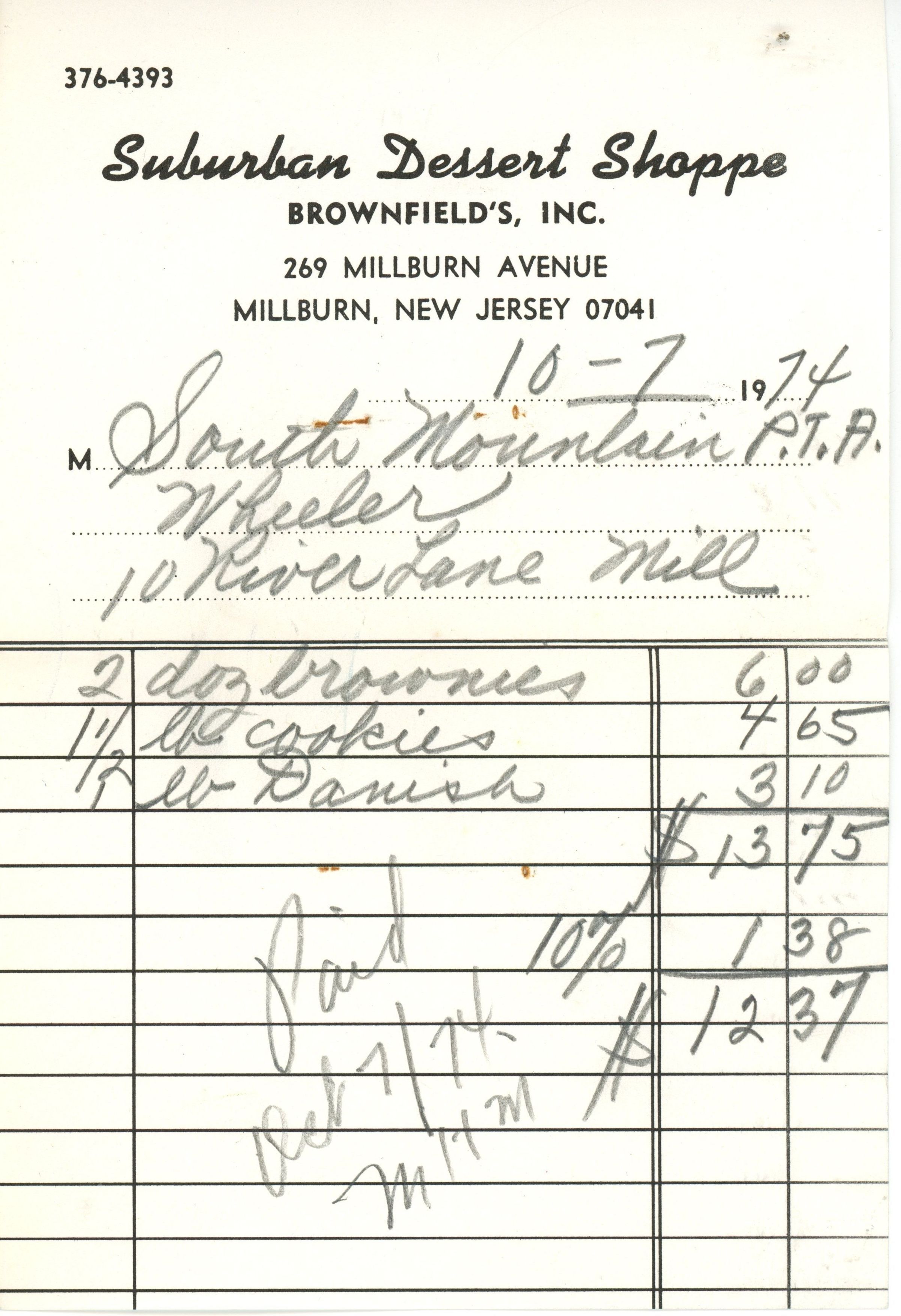 Receipts from the Suburban Dessert Shoppe, 288 Millburn Avenue, for refreshments purchased by the South Mountain School PTA for various meetings and events.Acquisition