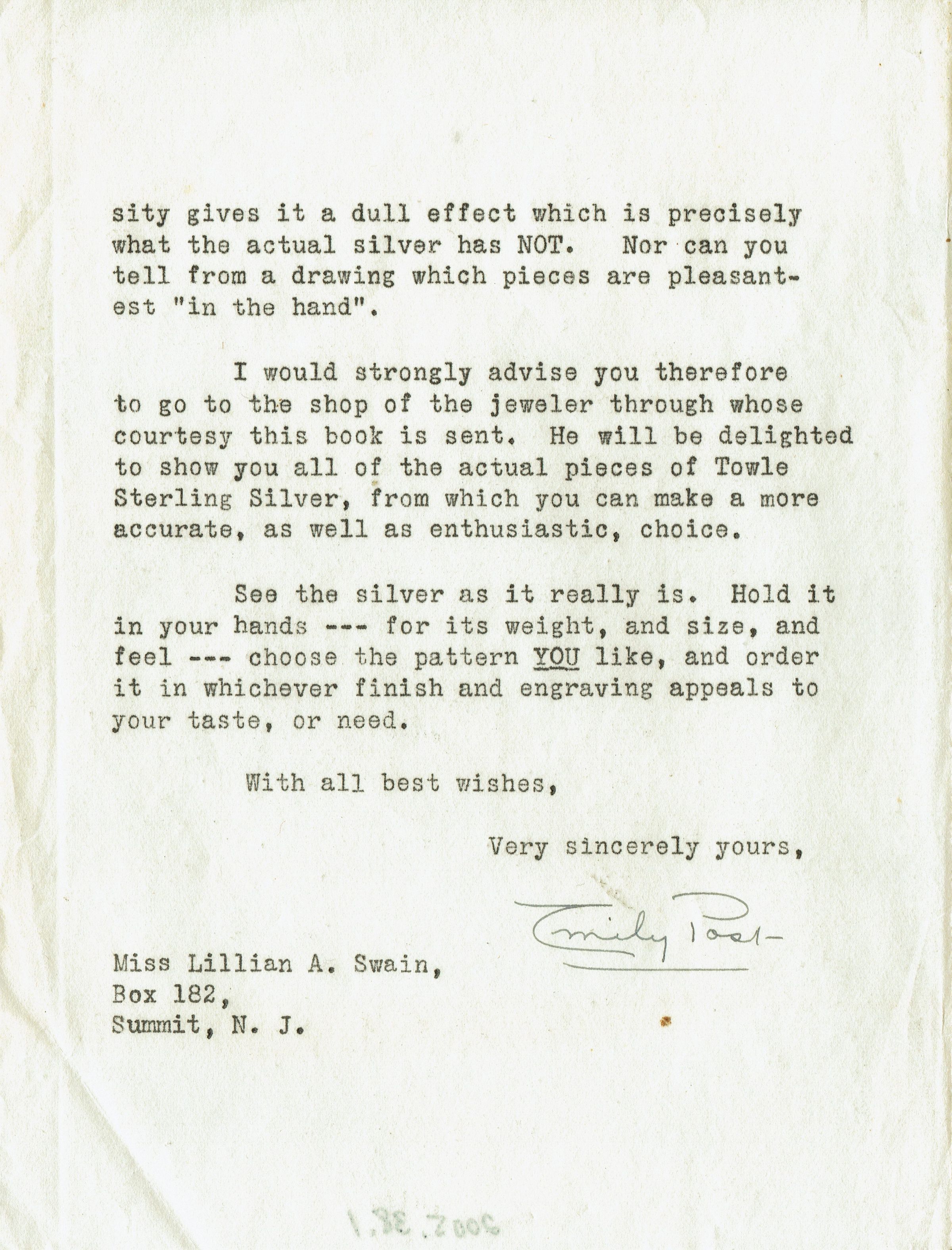 Swain: Emily Post Autograph Letter to Lilian Swain, 1930Entry/Object ID