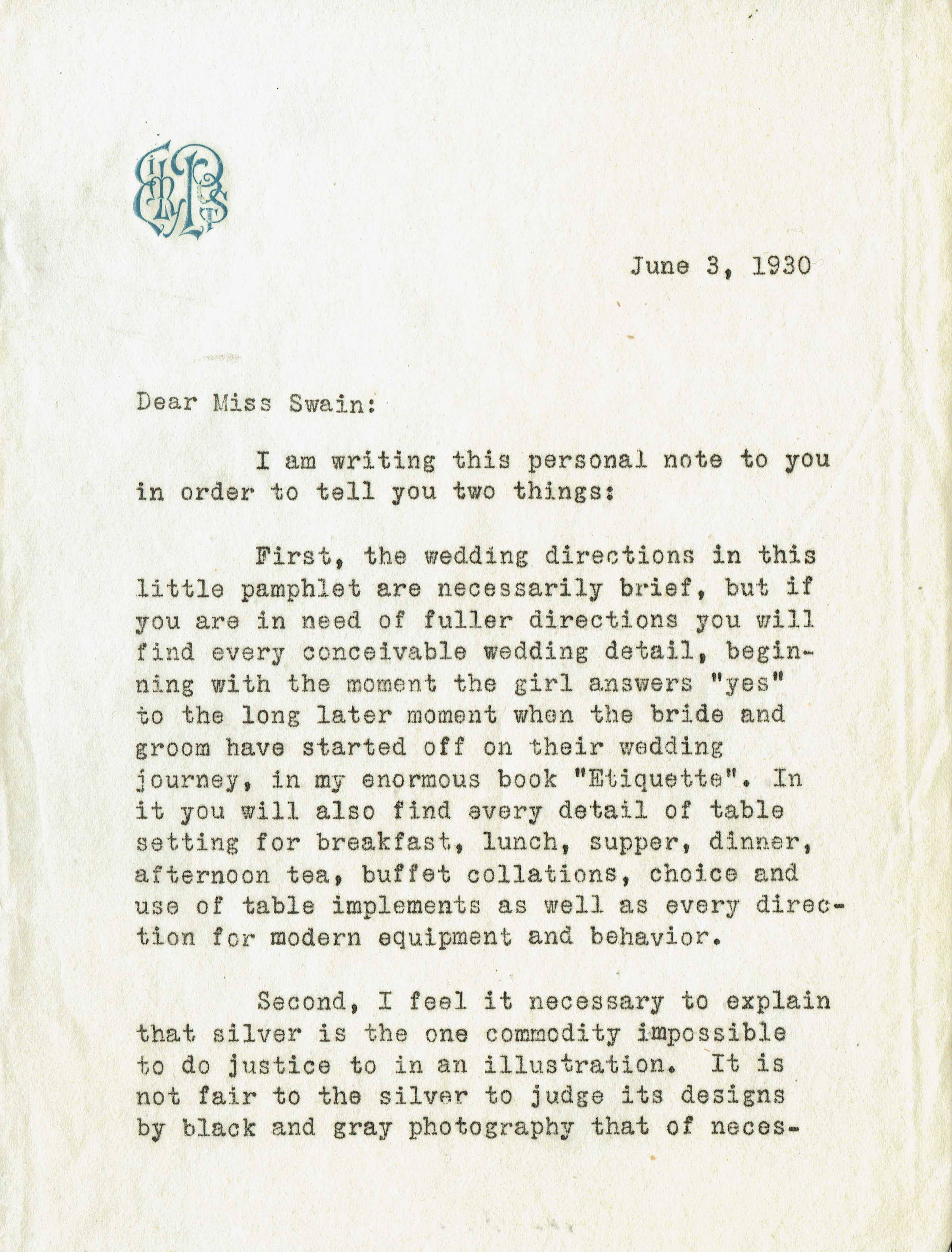 Two page letter written on Emily Post's monogrammed stationery and signed by Emily Post, dated June 3, 1930 to Miss Lilian Swain. The letter describing the purpose of the wedding directions pamphlet, but also advising Miss Swain to consult her enormous "Etiquette" book for fuller directions.Collection