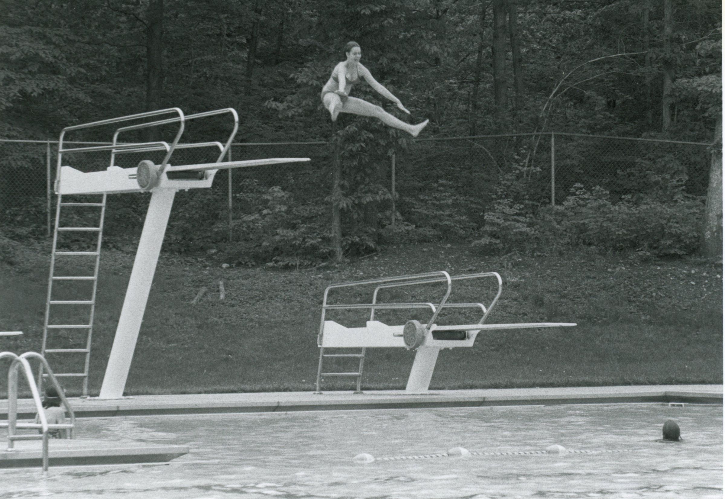 Photograph of a woman jumping off the high diving board at the Millburn Pool taken by Jerry Horn c. 1977-1979. Identity of the person is unknown.Collection