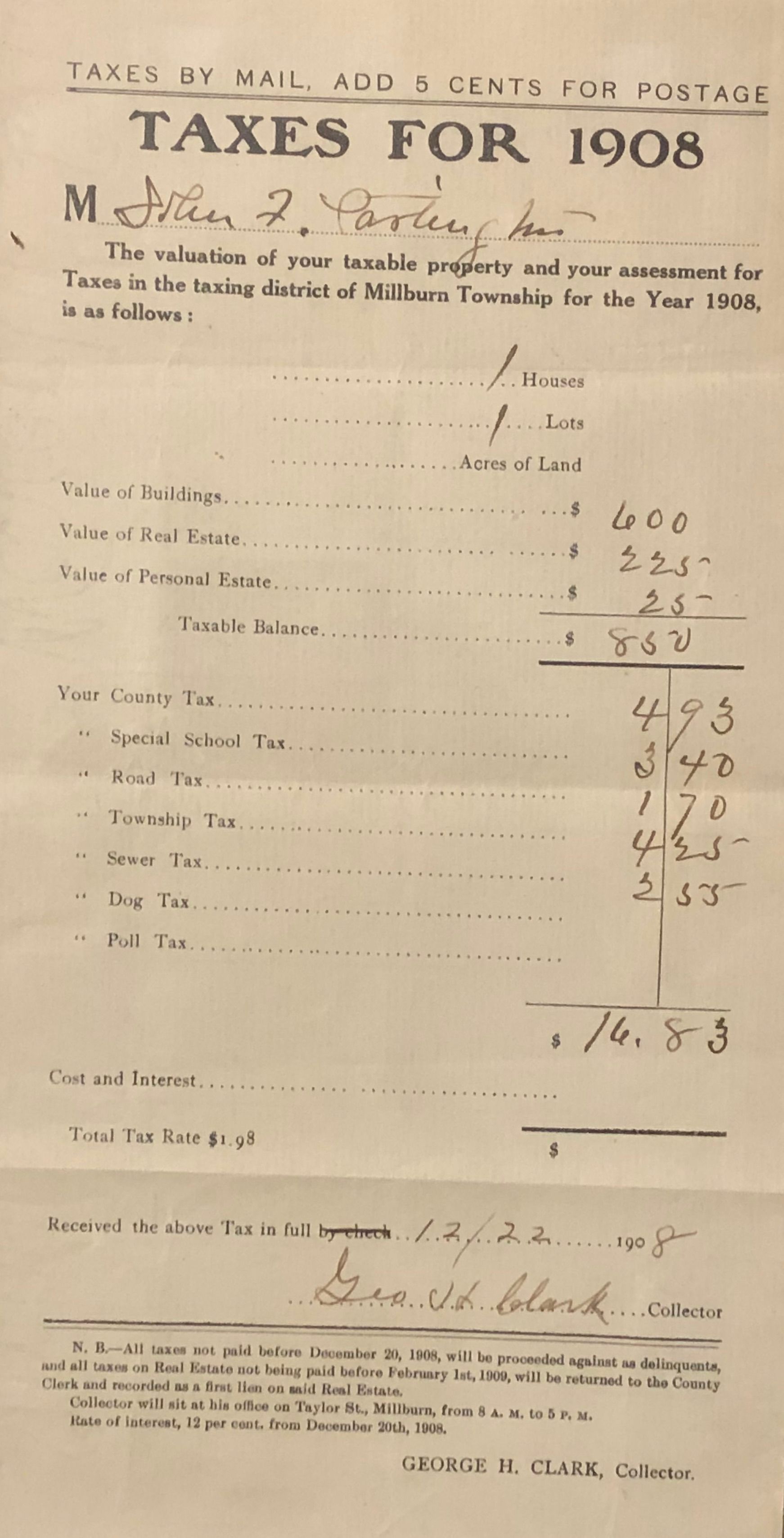 Framed Tax Bill for John F. Partington from 1908, signed by George Clark.Acquisition