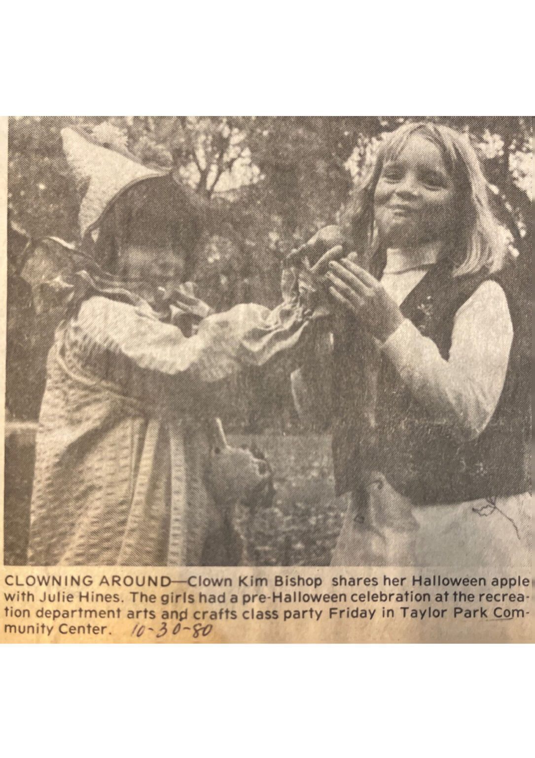 Black and white photograph of Kim Bishop and Julie Hines sharing an apple. Both girls took part in the arts and crafts class at the Taylor Park community center. Dated in October 30th, 1980.Photograph Details