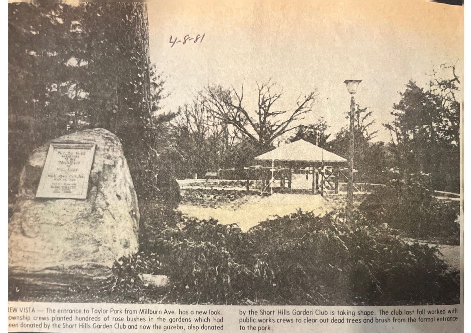 Black and white photograph of the entrance to Taylor Park from Millburn Ave. Dated in April 8, 1981.Photograph Details