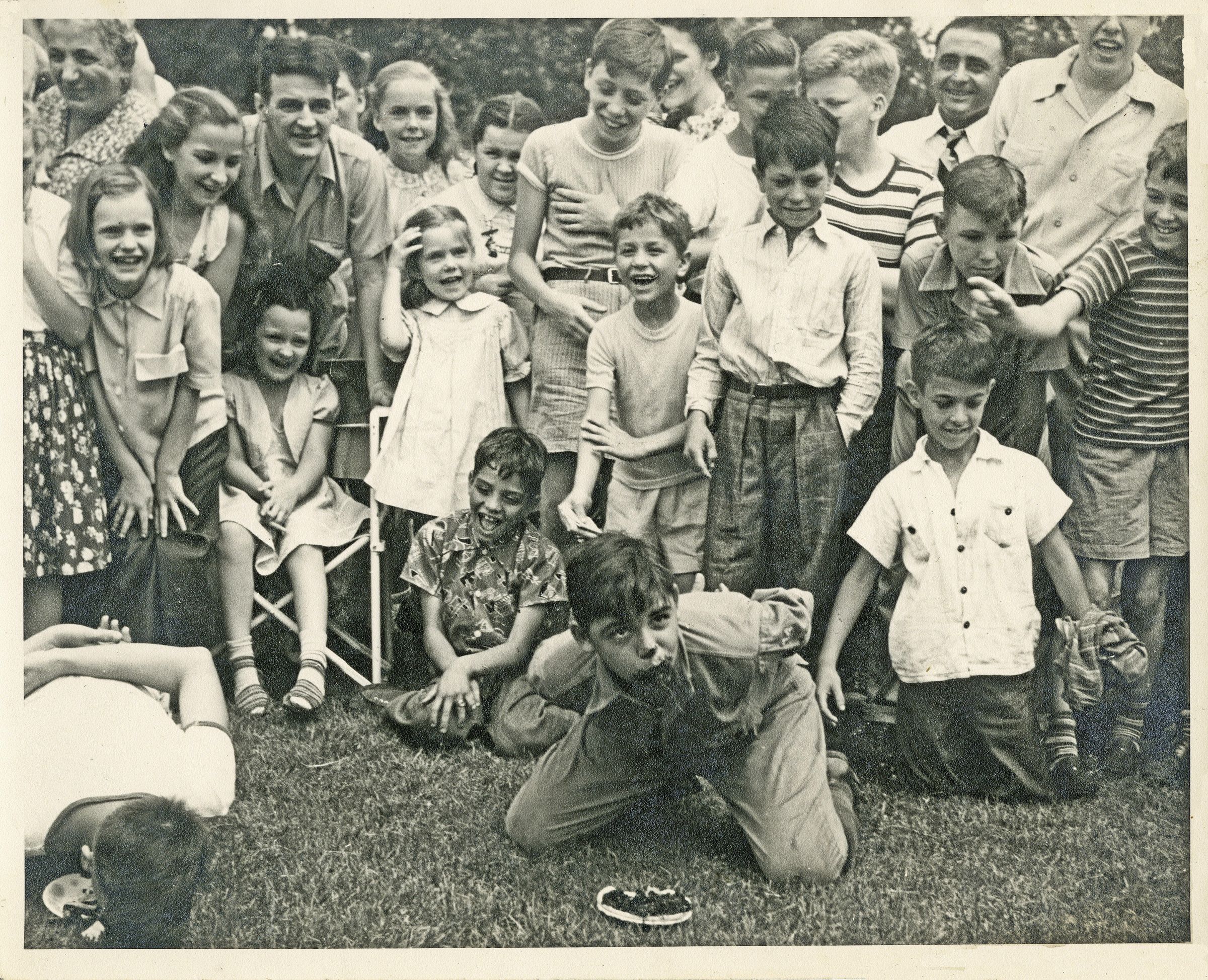 Description from Joseph J. Balbo (b. 1936). The photograph was taken in Taylor Park, c. 1943-44 (WWII period). The pie eating contest was part of the annual games and sports contest for kids. Among those identified in the photograph are Mr. Carbone (standing in the back wearing a tie), Phil O'Cone ("chicky") kneeling, holding a shirt in his left hand. Dan Del Nonne standing with his left hand in his pants pocket. Joe Balbo sitting on the ground with his hands on his right knee. Barbara L. Fiola is sitting in the chair.
