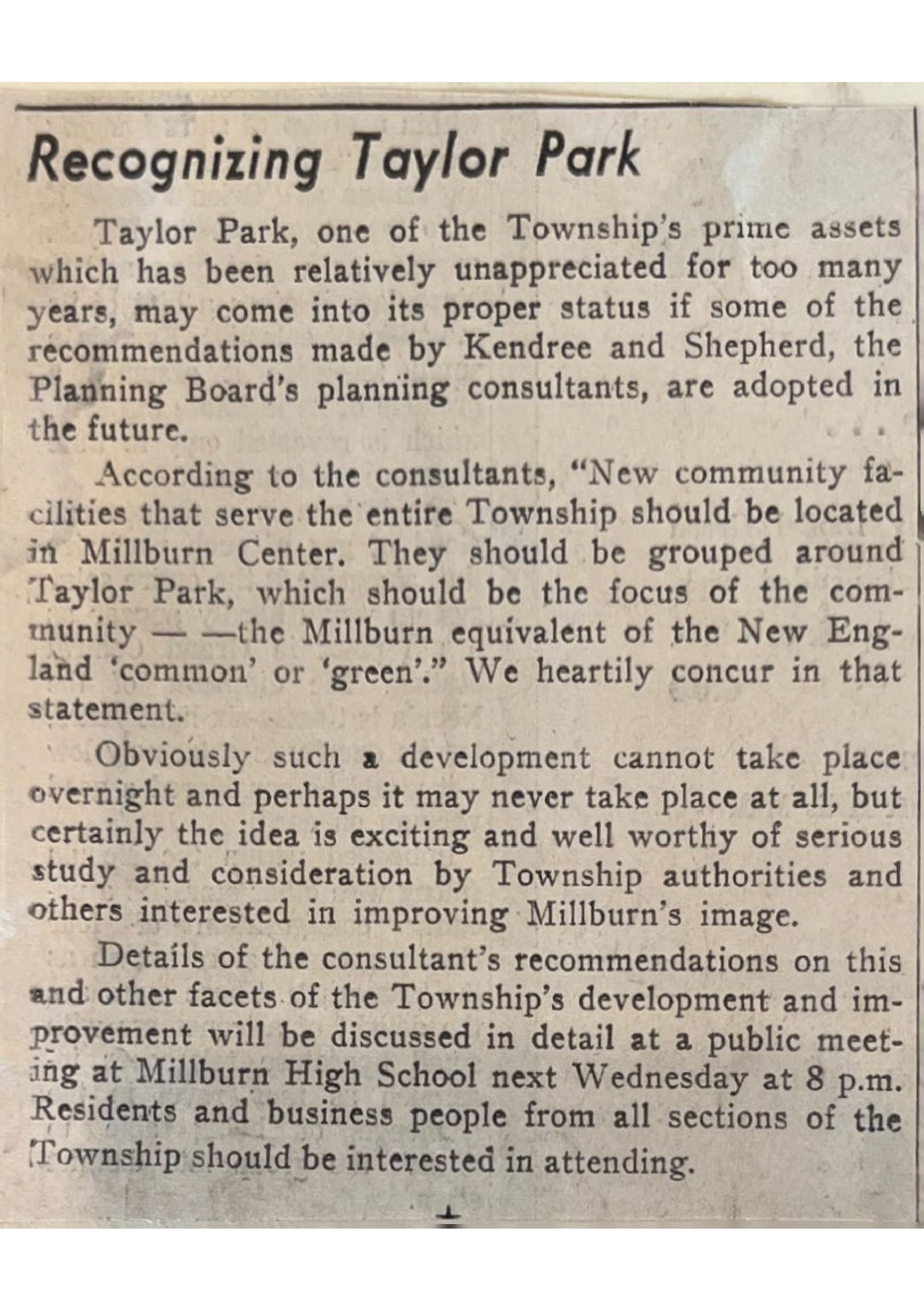 Black and white article of Taylor Park detailing its value in the past and future development of Millburn-Short Hills. Found in the 1963 Recreation Department scrapbook.Acquisition