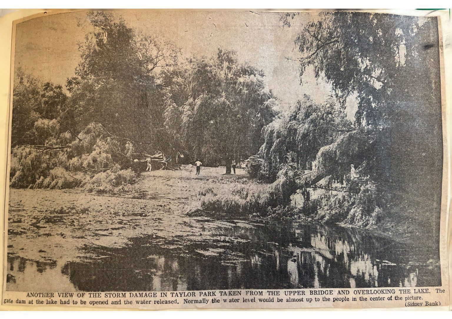 Black and white photograph of the storm damage affecting the Taylor Park lake. Damage resulted in the dam being opened to release water. Photographs were taken from the upper bridge. Found in the 1963 Recreation Department scrapbook.Photograph Details