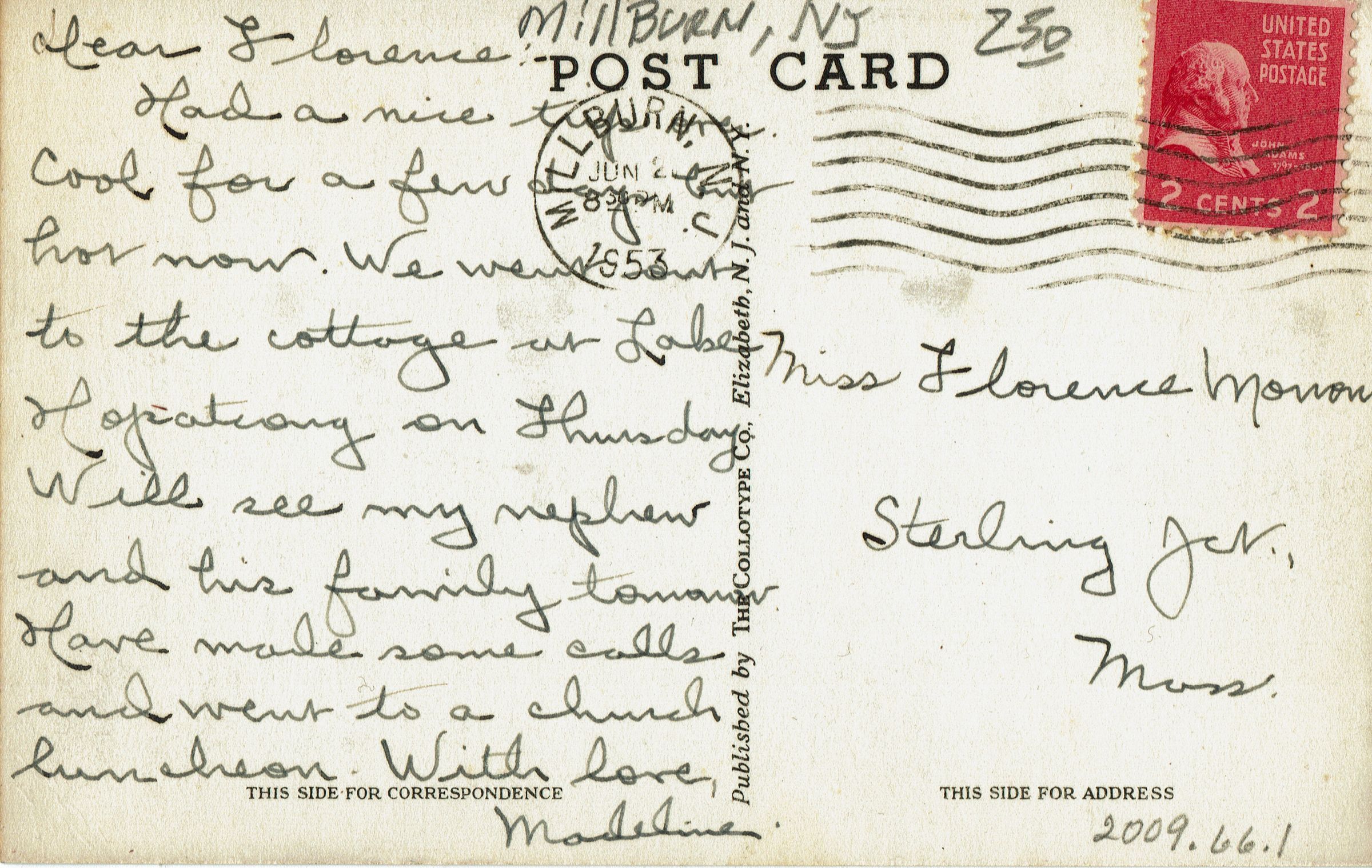Postcard from Madeline in Millburn to Miss Florence Monon, Sterling Junction, Massachusetts postmarked June 2, 1953.Collection