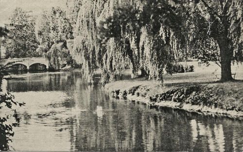 Postally used, b/w, real-photo postcard of the West Branch of the Rahway River pond in Taylor Park, the weeping willows at the edge of the pond, and the footbridge over the river. The postcard is postmarked 1940 and was sent by "Mrs. Amos" to "Master Herbert Kahn" at 14 Collins Ave in Bloomfield NJ. The sender's inked message was: "Dear Herbert, Will be looking for you Sun. 15th. I know you will be there. Sincerely, Mrs. Amos; Big party this month."Collection