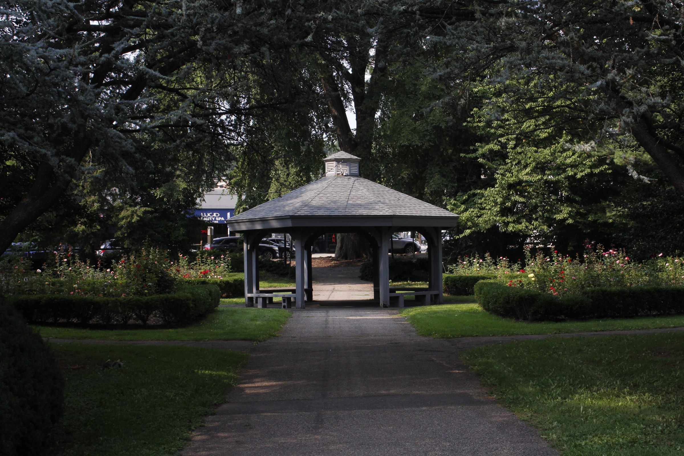 Photograph of the Wallbridge Rose Garden and Gazebo looking north from Taylor Park toward Millburn Avenue taken by Julian Chua in August 2024. The Wallbridge Rose garden was named for Gertrude Wallbridge, one of the founders of the Short Hills Garden Club, who also maintained an award-winning garden at her house at 11 Jefferson Avenue.Photograph Details