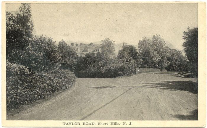 Real-photo postcard of dirt road, labeled "TAYLOR ROAD, Short Hills, N.J." Could be Western Drive, part of which used to be named Taylor Road (the section on which the Watson house was). Top floor of a house can be seen in center of card, behind trees. Only other things seen in the photo are the dirt road, trees, and the shadow of a telephone pole. Card is postally unused and very lightly soiled all over. Front is yellowed more than back. Publisher is ".M. Simon, 32 Union Square, New York."Acquisition