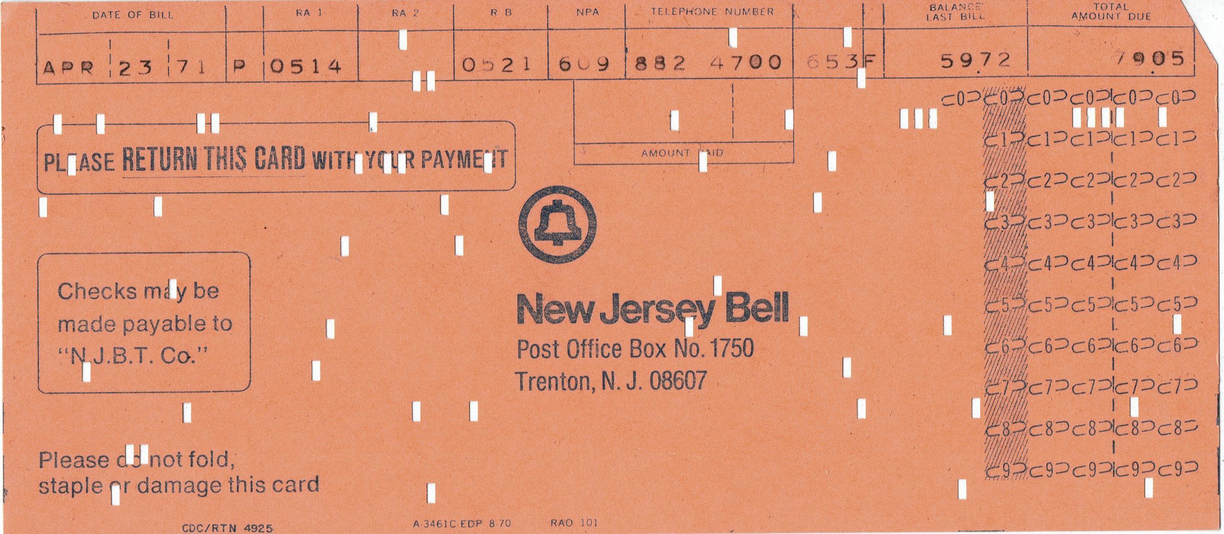 Computer punch card for New Jersey Bell telephone bill payment from April 23, 1971. Punch cards were widely tools for business data-processing throughout the 1950s & 60s. The NJ Bell card is a later use of the this format and was to be returned with payment for processing,Acquisition