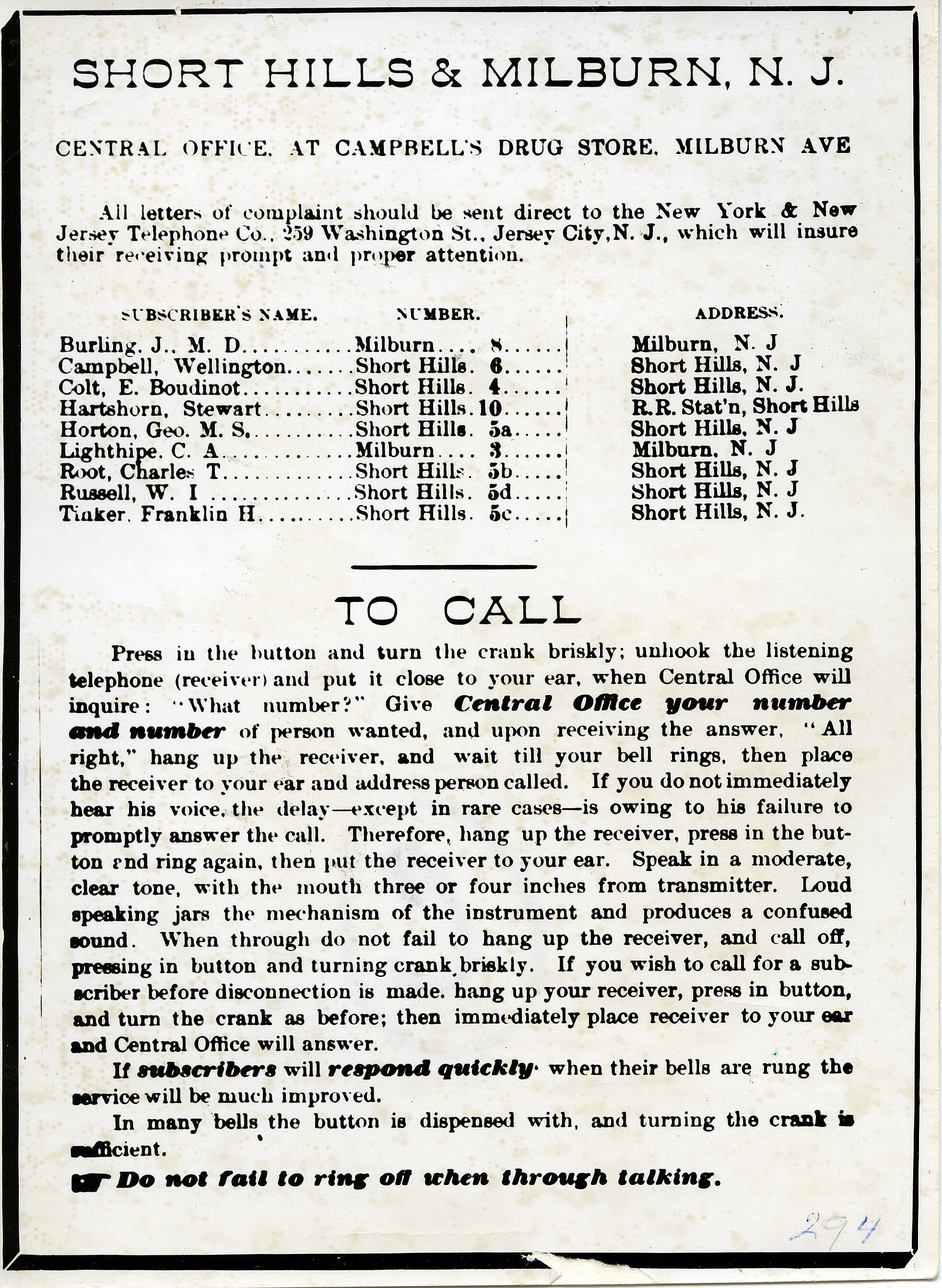 Telephone Central Office was located in Campbell's Drug Store on Millburn Avenue. Subscribers were: J..M..D. Burling, Wellington Campbell, E. Boudinot Colt, Stewart Hartshorn, George M.S. Horton, C.A. Lighthipe, Charles T. Root, W.I. Russell, Franklin H. Tinker.Collection