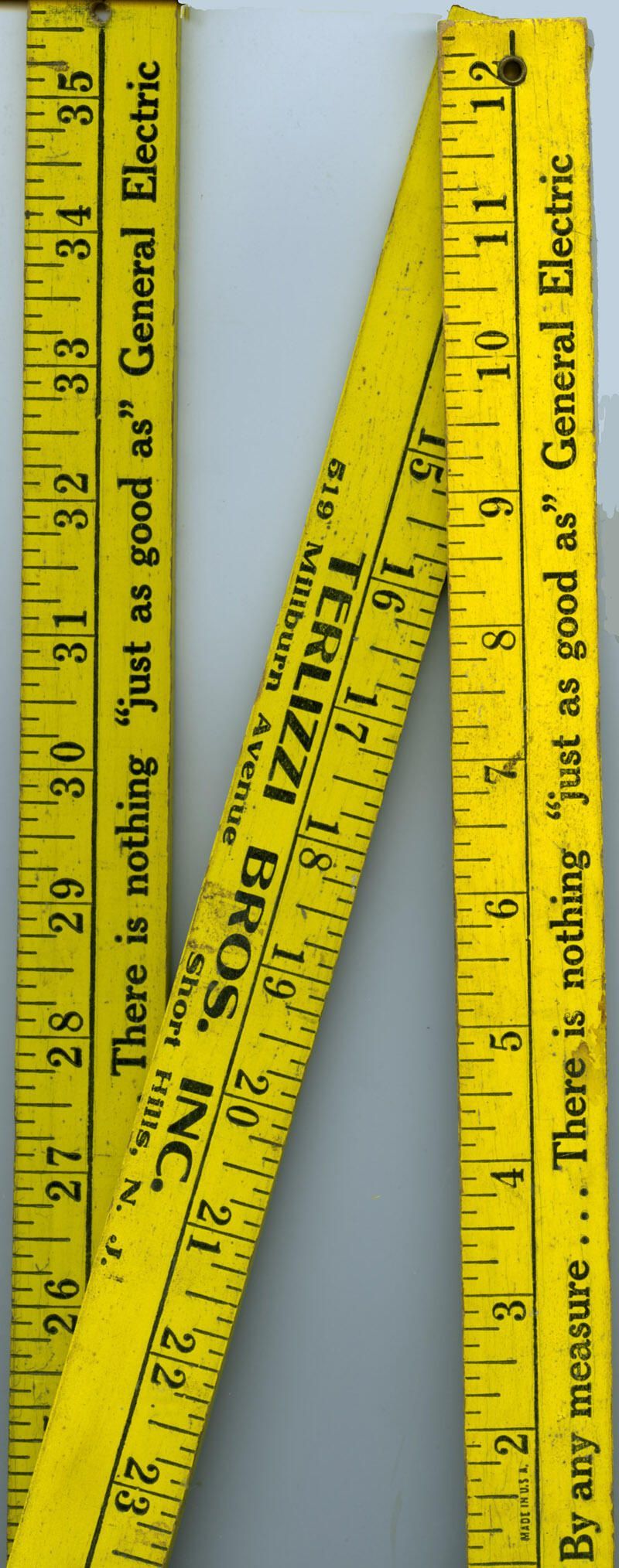 Folding yellow yardstick from Terlizzi Brothers, Inc. The address printed on the yardstick is: 519 Millburn Avenue, Short Hills, NJ. The Terlizzi Brothers store was not recorded in the society's 1952 directory and first appeared in the next book in the collection, the 1960 directory, but at 42A Main. It is not known when they were at 519 Millburn Avenue, home to Chai Center Judaica in 2013. The last entry for Terlizzi Brothers was in the 1962 directory. The memento from that Millburn store led to online resources that noted that the Terlizzis were early local sellers of home air conditioners and other appliances. The Terlizzi brothers were Frank and his two-years-older brother Louis Terlizzi, both of whom lived in Bloomfield in 1930, at which time they had an electrical contracting business.