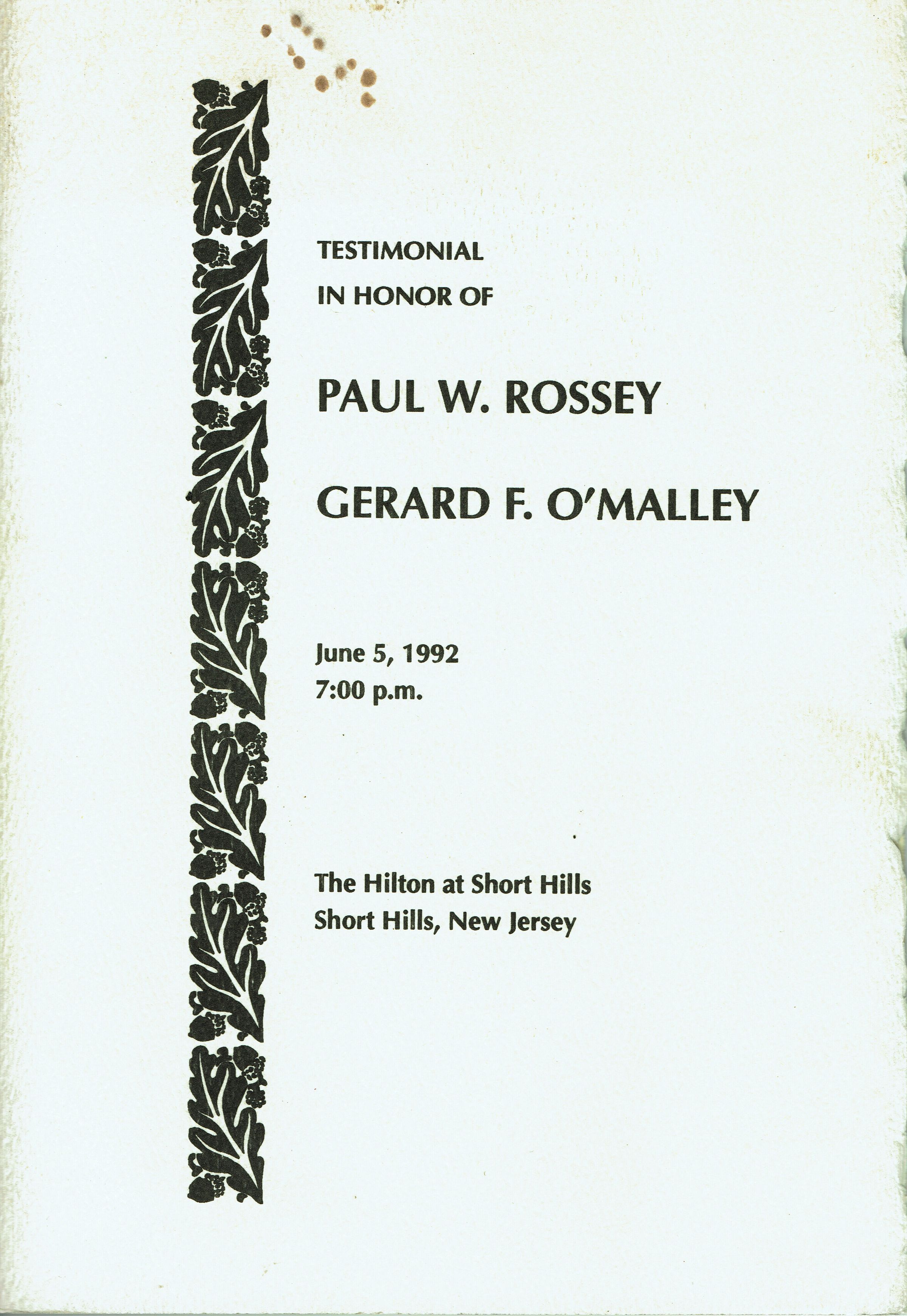 Testimonial Program in honor of Paul W. Rossey & Gerard O'Malley, 1992Entry/Object ID