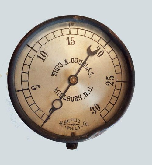 5.25" diameter round metal and glass pressure gauge marked "THOS.A.DOUGLAS.;MILLBURN, N.J.;H.BELFIELD Co.;PHILA." Back of the gauge is painted black, as is 1.25" of the side. The rim of the gauge is wrapped with a rusted iron band 1.5" of which curves around the edge to the side. At the bottom of the gauge are two rusted screws and a ca. 1/2" long threaded mounting bolt. There are two dings in the metal rim; one at 2:00 o'clock and the other at 5:00 o'clock. The bottom/back rim has considerable wear and paint is chipped off all around. Near the center of the back are two tiny round spots of missing paint and a number of overall other pinprick-sized bubbles of missing paint. Next to the N.J. on the face of the gauge is a 1/8" sliver of missing silver color.Acquisition