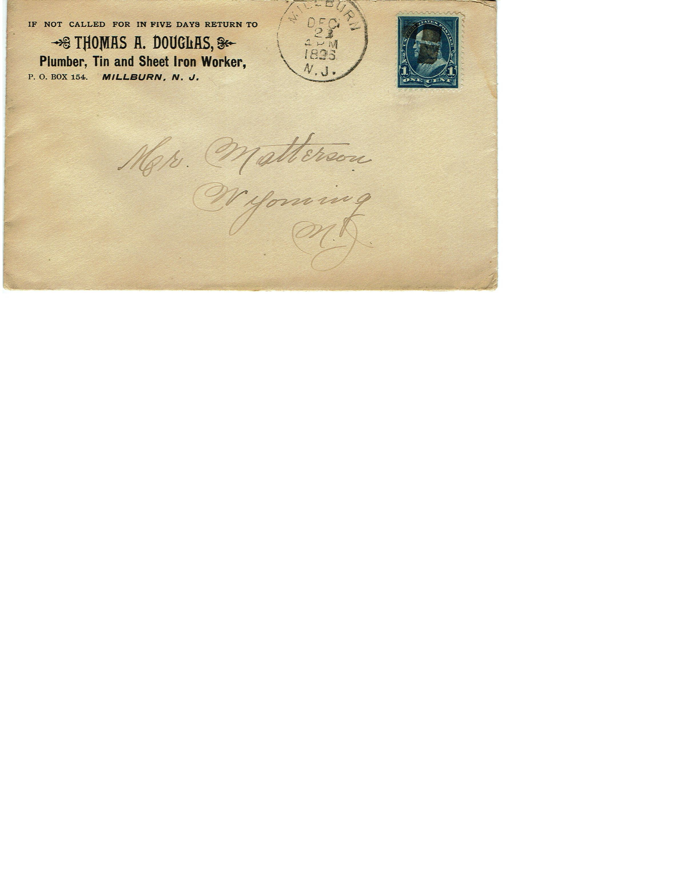 Thomas Douglas Plumber, Millburn 1896 EnvelopeEntry/Object ID