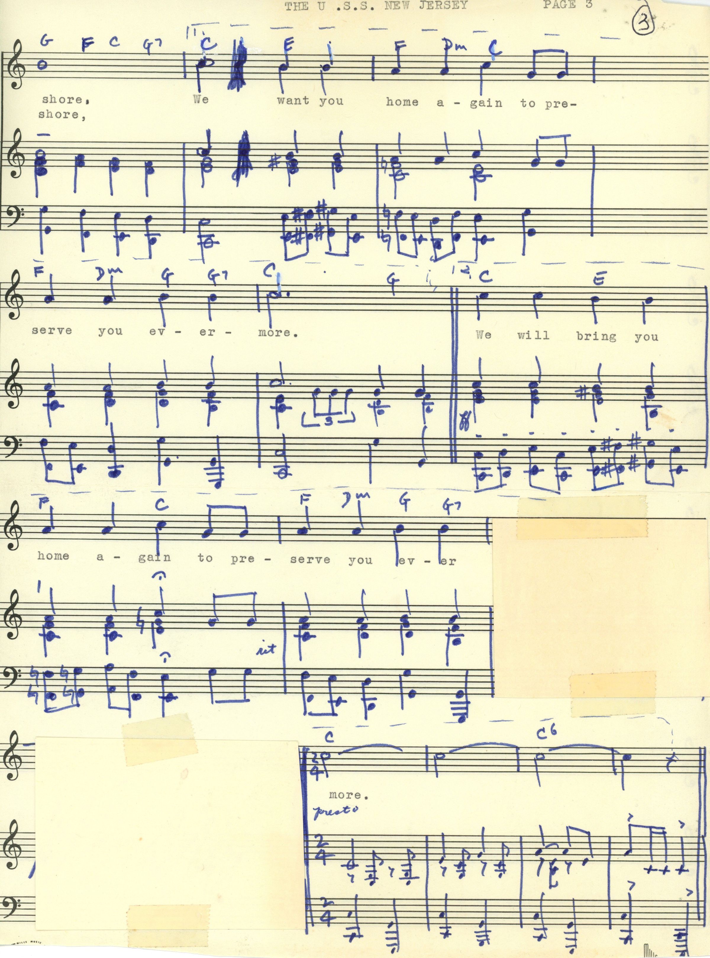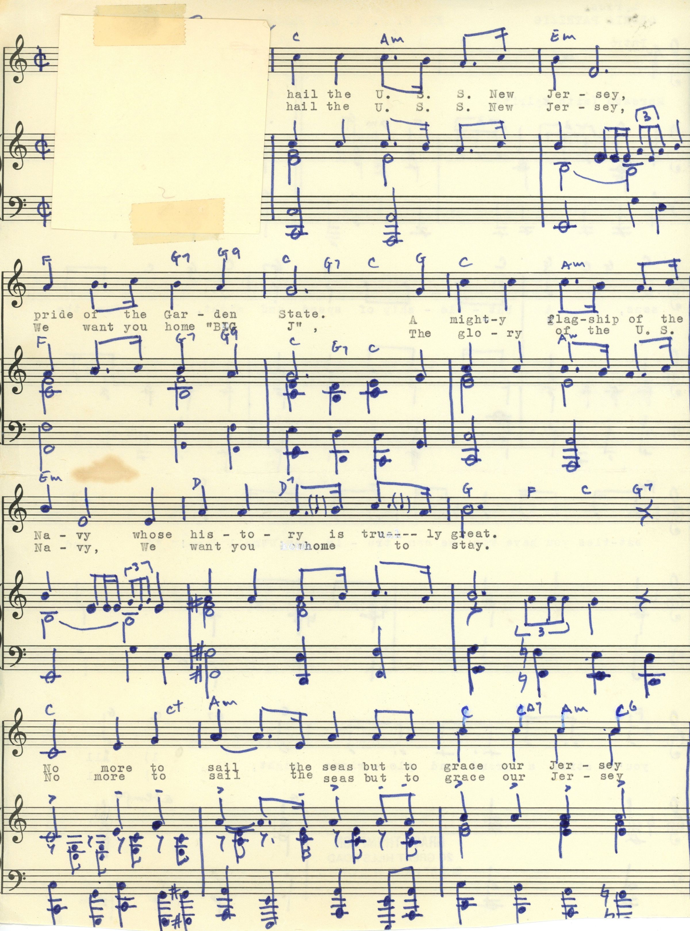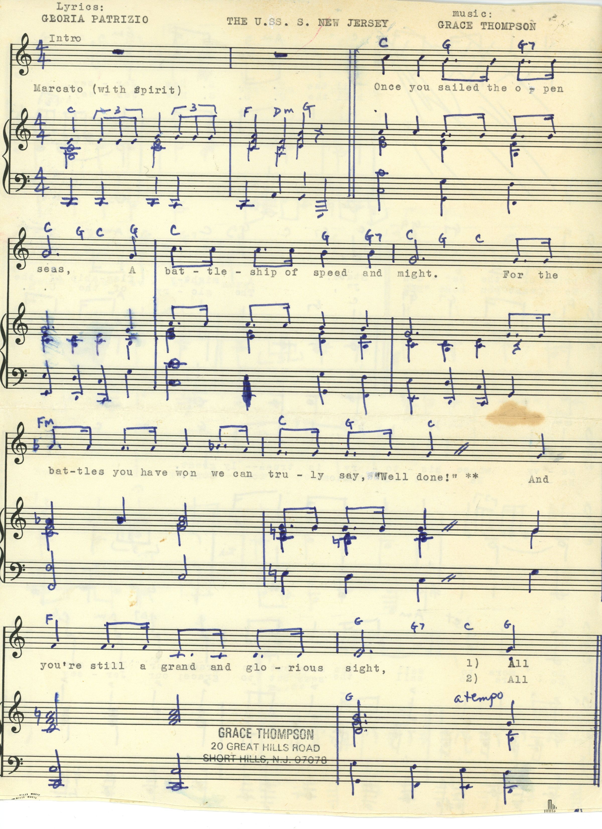 Three page original score with hand-written music to "The U.S.S. New Jersey" song written by Short Hills residents Gloria Patrizio and Grace Thompson in 1976. The song received its copy right on March 16, 1976.Acquisition