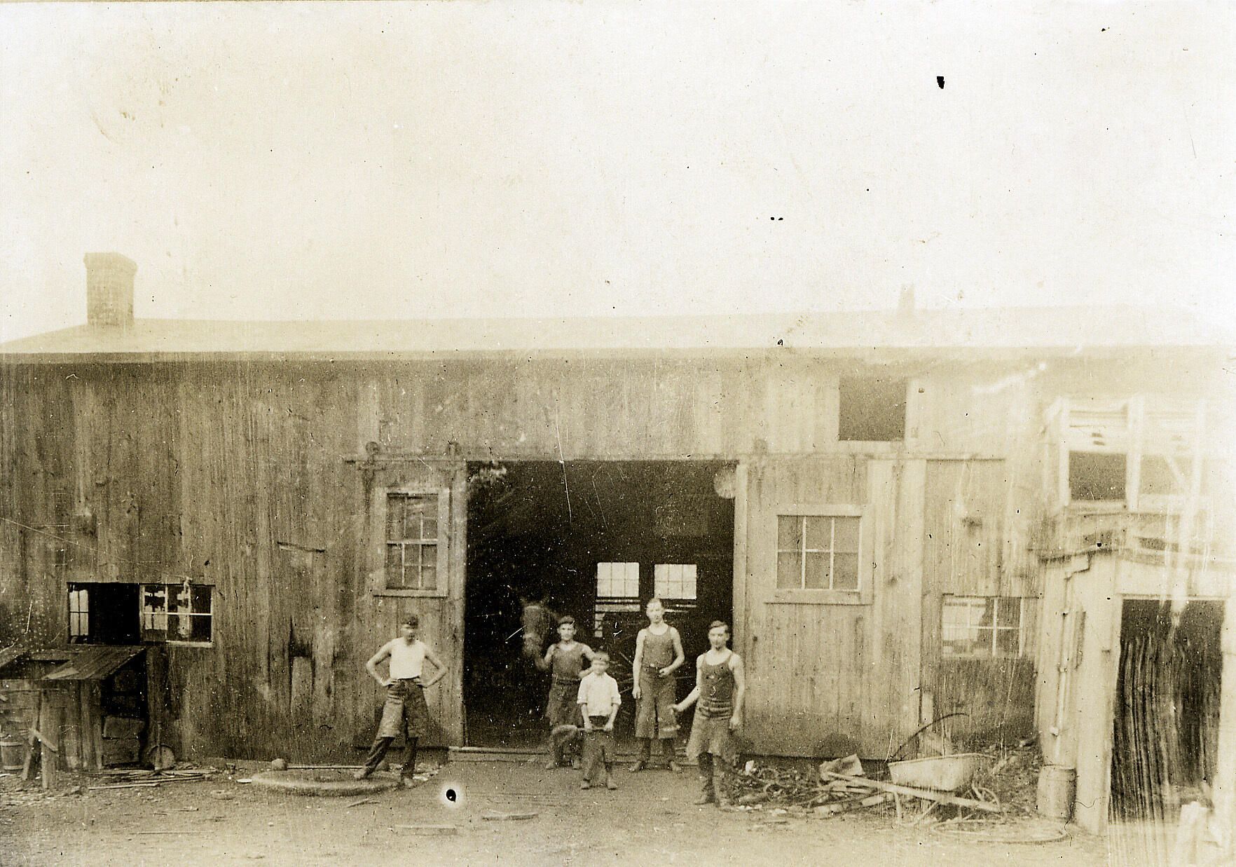 Tichenor's Blacksmith Shop stood near the present entrance to Taylor Park on Millburn Avenue. Pictured are (left to right): Frank Tichenor, Fielo (a helper), Irvin Smith, Edward Tichenor and Charles Tichenor.