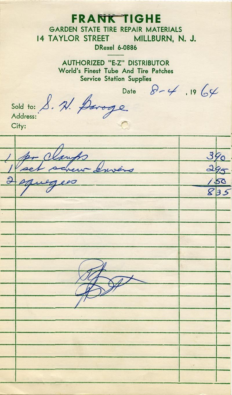 Two 1964 invoices from Frank Tighe (Garden State Tire Repair Materials) to the Short Hills Garage, former business at the corner of Woodland and Chatham Roads, on the post office side of Woodland. Invoices are stapled together; top one is dated 8-4-1964 and bottom one is dated 8-24-1964. These invoices were found in the attic of the former Citgo Station, when the owner at that time (Larry) was cleaning it out prior to selling the business. Invoices are clean, with slight yellowing on edges.Acquisition