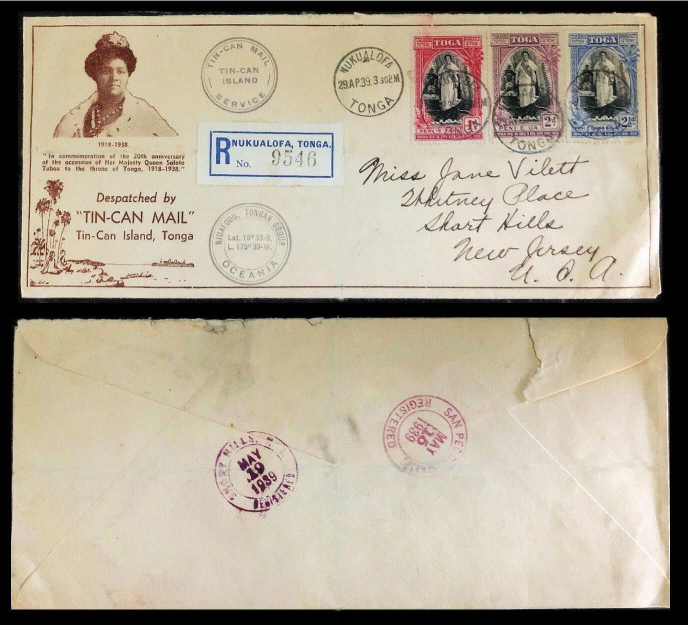 A 1939-cancelled envelope marked Tin Can Mail from Tonga and sent to a young Jane Vilett, then at 91 Whitney Road in Short Hills. See the story of Tin Can Mail at http://www.mshhistsoc.org/content/tin-can-mail-short-hills. The Tin-Can Island mail was literally sent in a tin can and had to be delivered to the offshore boat by the island's strongest swimmers carrying it through shark-infested water. Inside the envelope is a 4.75" w x 1.75" slip of blue paper, on which is written: "Dear Jane -- Sorry I haven't any paper on which to write. Love to all, Rachel." The envelope is yellowed, has edgewear, overall light soiling, and bumped corners. The front and back of the envelope have a horizontal and vertical blue (penciled?) line that divide the surfaces into equal quarters, for purposes unknown. A 1.75" piece of the envelope flap is still attached to the front of the envelope, but the rest of the flap is attached to the back of the envelope. There are two 1939 cancellations on the rear of the envelope and six cancellations on the front of the envelope. There is an older penciled price of 15.00 on the front of the envelope and "#13." A 2" w x .75" sticker applied to the front of the envelope is marked: R NUKUALOFA, TONGA; No. 9546." The left side of the front of the envelope is printed with an image of Her Majesty Queen Salote Tubou, 1918-1938, in commemoration of the 20th anniversary of her accession to the throne of Tonga. Beneath that is printed: "Despatched by 'Tin-Can Mail'; Tin-Can Island, Tonga. Purchased on eBayAcquisition