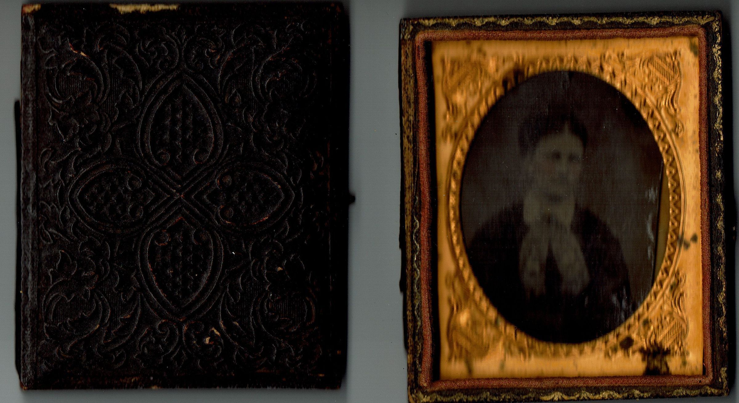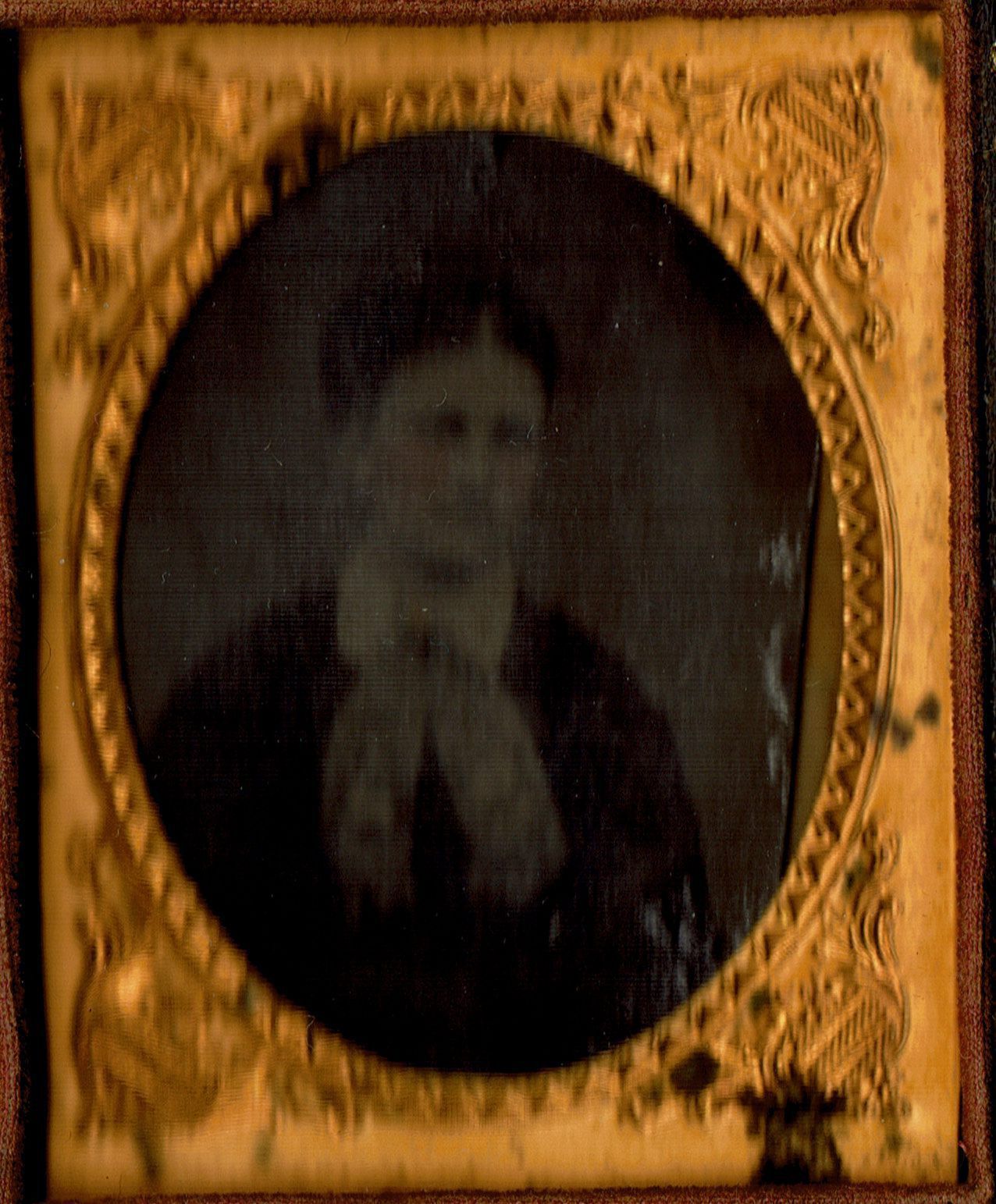 Hand-tinted tintype of woman wearing a scarf. The tintype is mounted in a frame and case.Acquisition