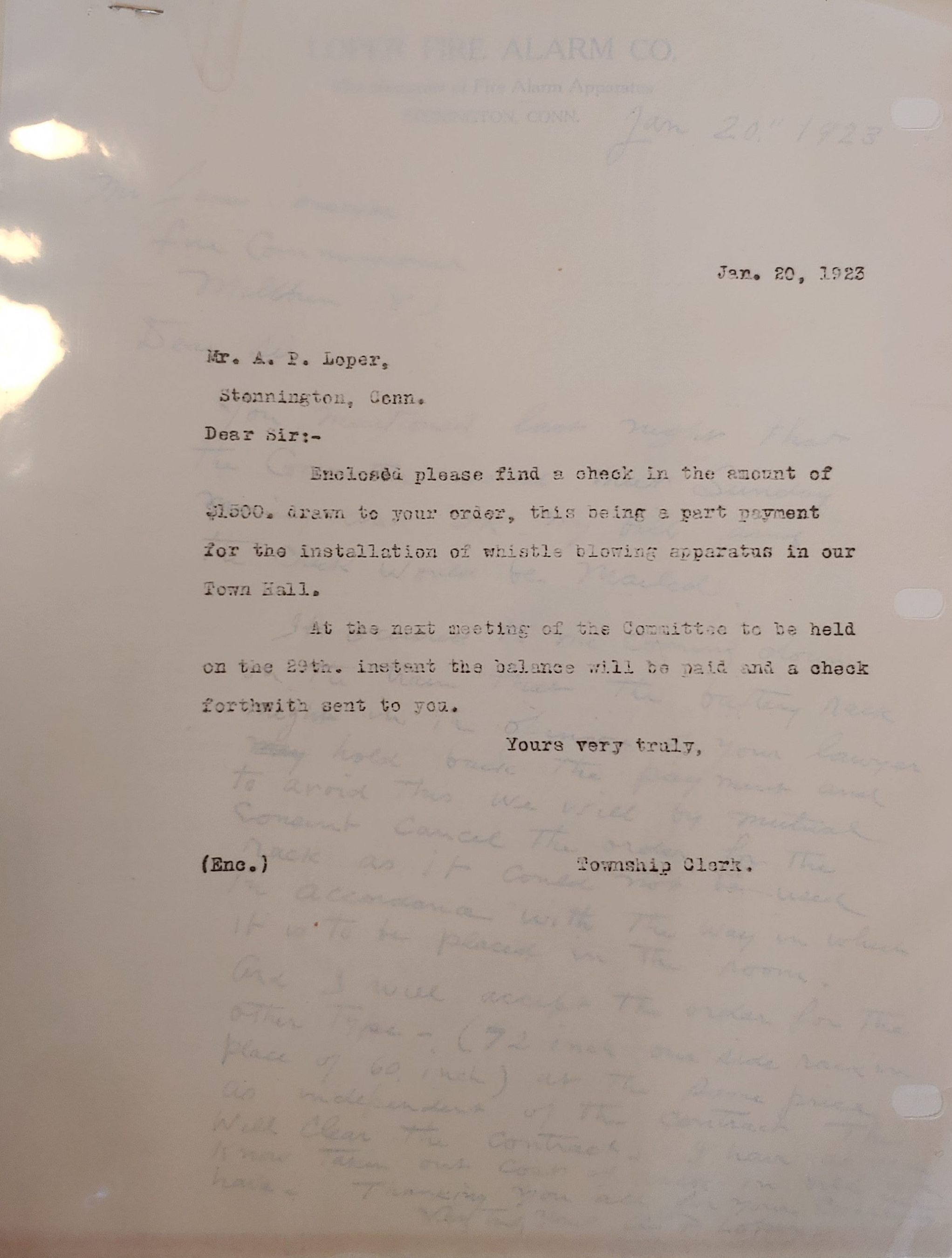 Letter from Township Clerk to Mr. AP Loper regarding the payment for the installation of the whistle blowing apparatus in the town hall.