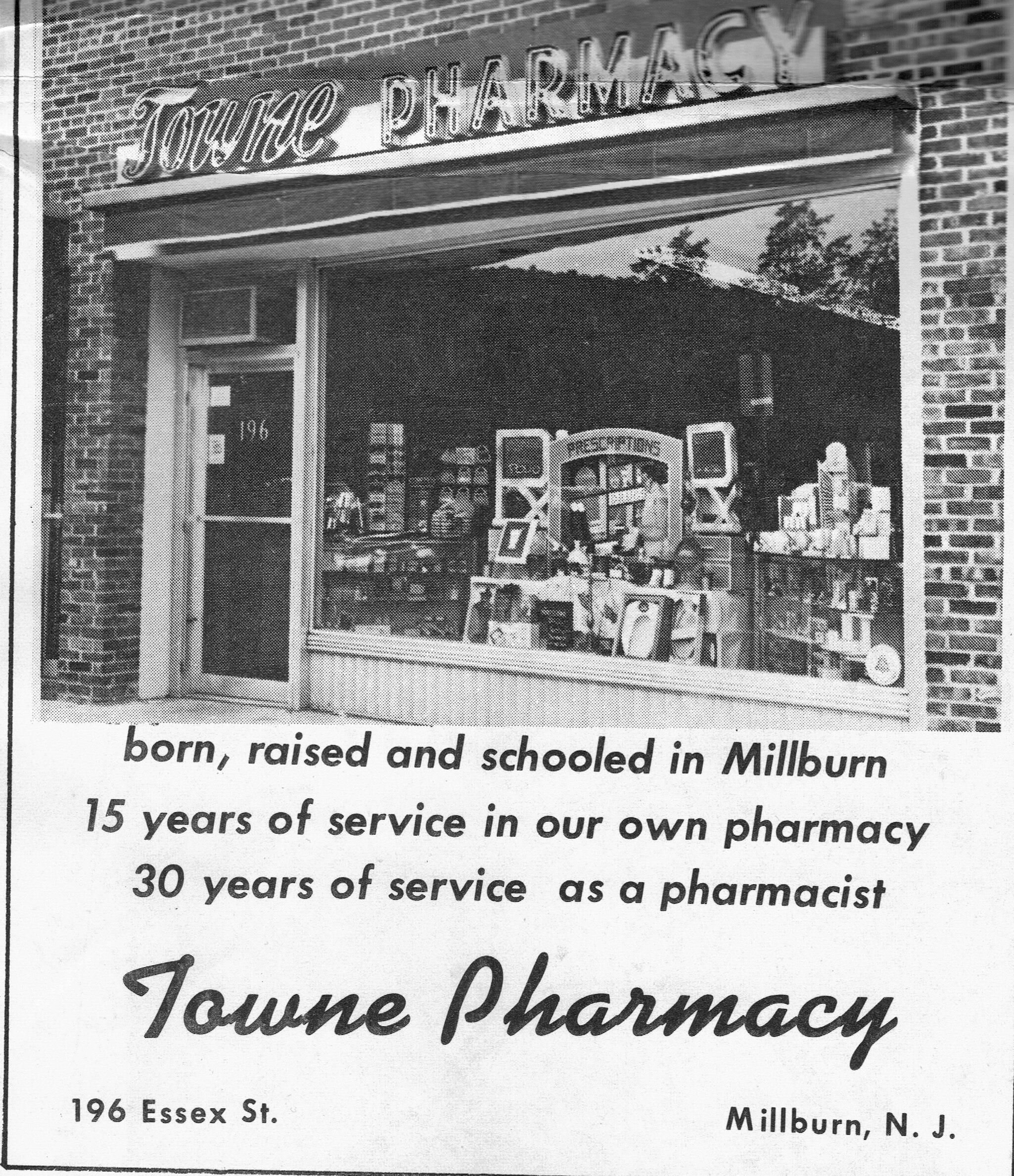 Advertisement for Towne Pharmacy at 196 Essex Street, Millburn from the October 17, 1968 80th Anniversary Edition of the Item of Millburn and Short Hills