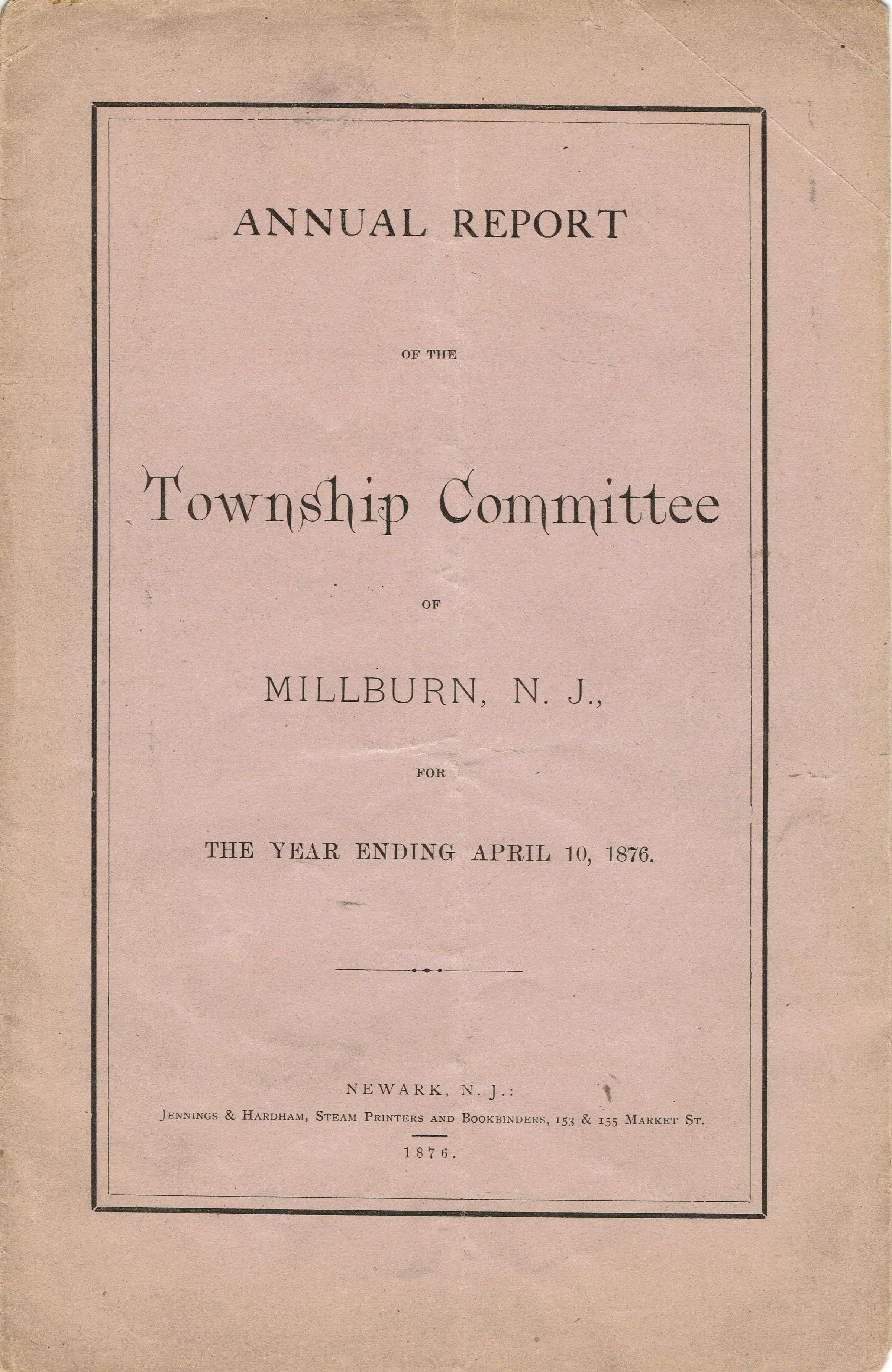 Annual Report of the Township Committee of Millburn, N.J. for the Year Ending April 10, 1976. 10 pp. Contains a list of receipts, disbursements, unpaid taxes (1875), unpaid taxes (1874).Township Committee members were: Oswald H. Sommers, Frank R. Condit, William H. Parsil, Edward Reeve, I.D. Condit, Jr. Theodore H. Sommers was Town Clerk.Acquisition