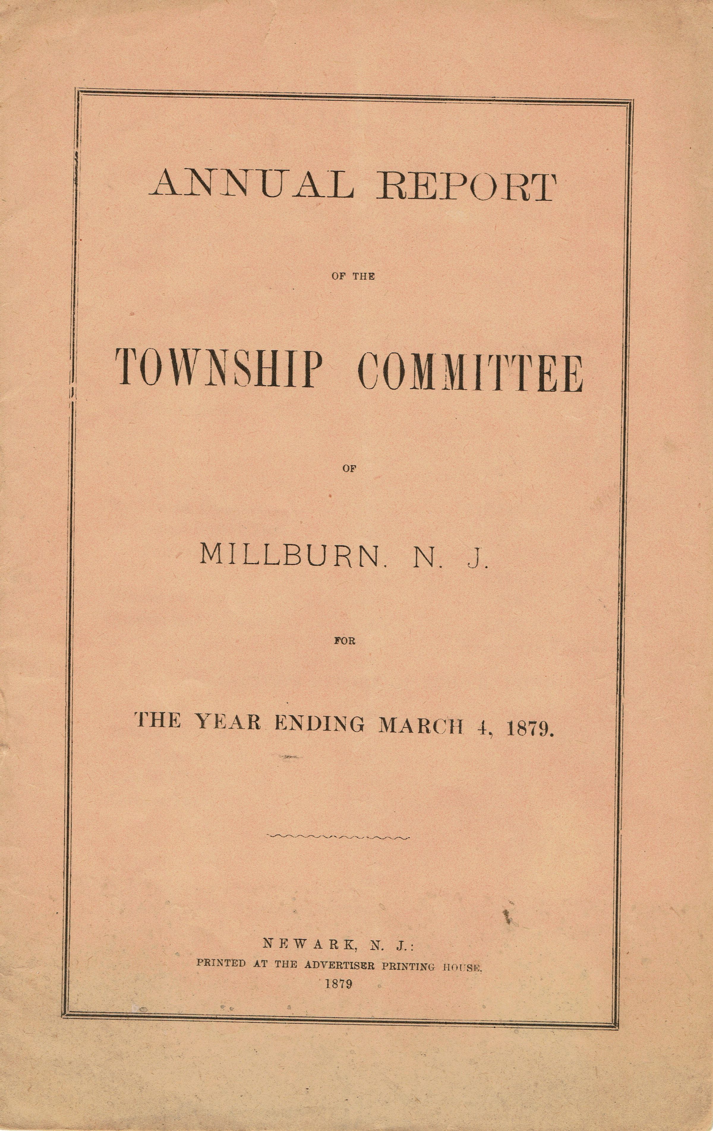Annual Report of the Township Committee of Millburn, N.J. for the Year Ending March 4, 1979. 8 pp. Contains a Collector's Report, School Fund, Treasurer's Report, unpaid taxes (1877 & 1878). Members of the Township Committee listed are: Israel D. Condit, Abraham J. Parkhurst, John D. Meeker, John S. Parsell. H. Park was the Town Clerk.Acquisition