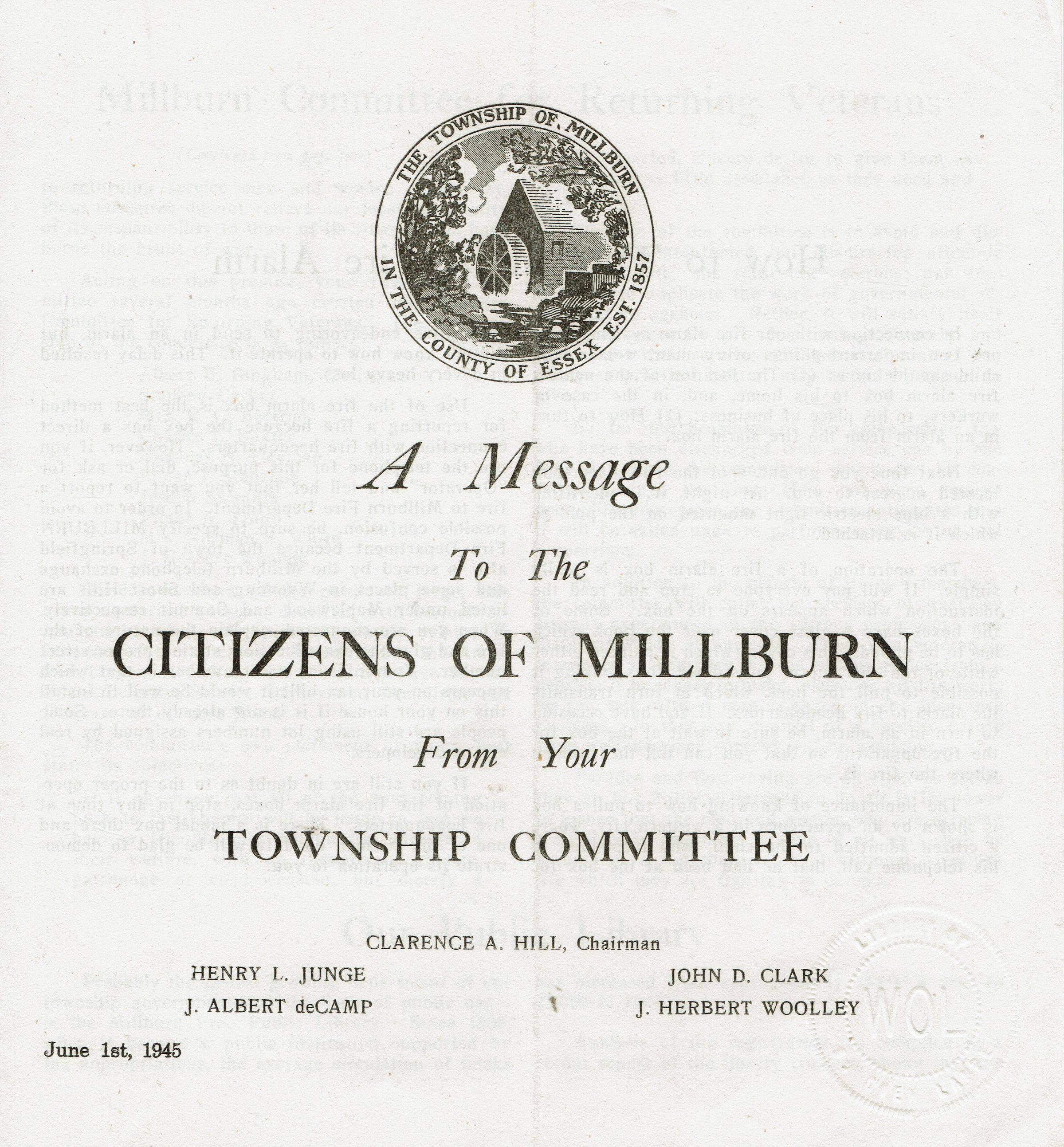 Township Committee Report, June 1, 1945. 8 pages. Charts of Services Received for Municipal Taxes Topics covered include: How to Turn in a Fire Alarm, Committee for Returning Veterans, Millburn Public Library, War Memorial Committee, Use of Parking Lot.Acquisition