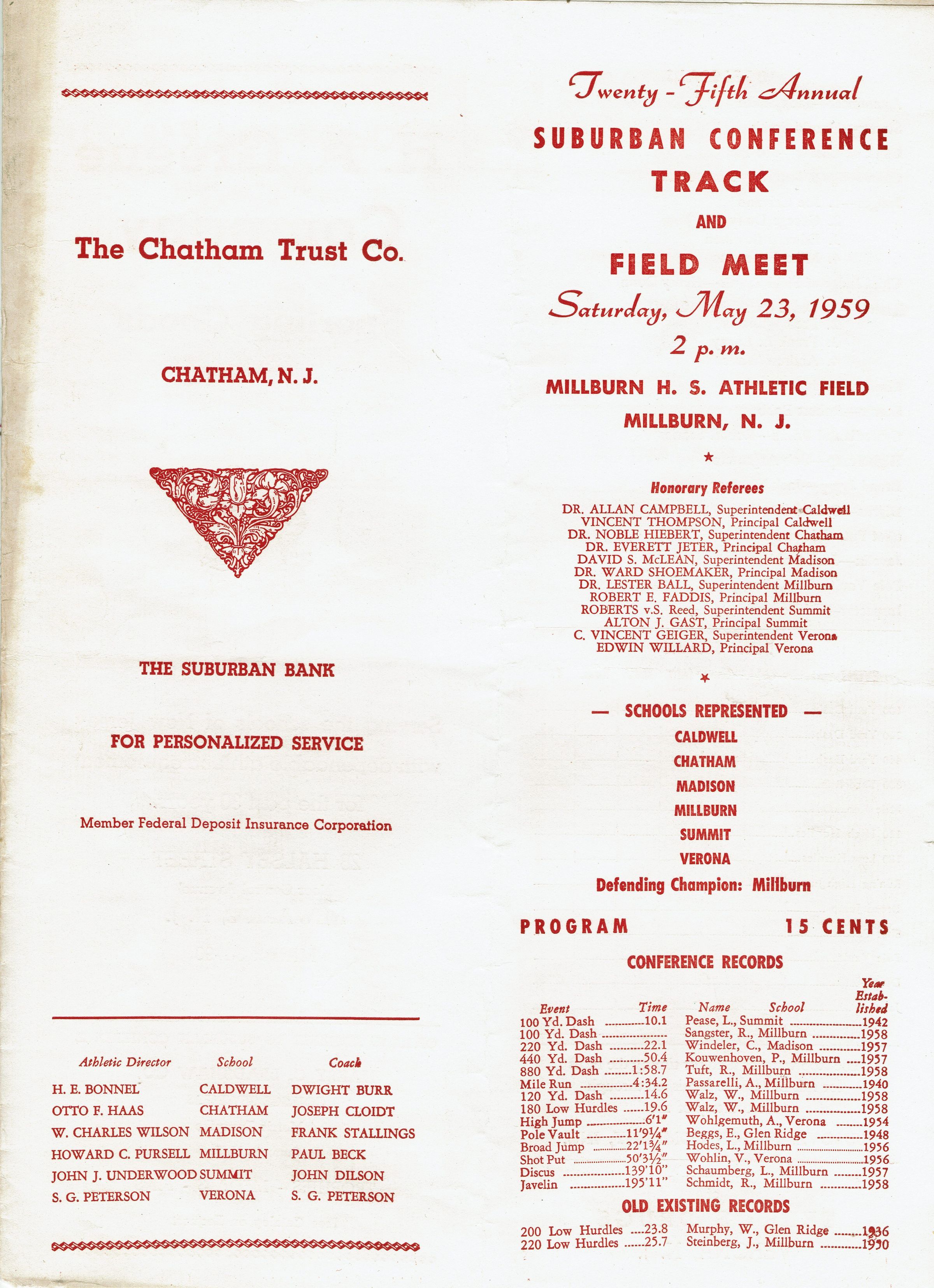 Program for the 25th Annual Suburban Conference Track and Field Meet, Saturday, May 23, 1959 at the Millburn High School Athletic Field. 4 pp. Contains lists of Conference records 1936-1950, list of participants in each event, athletic directors and coaches from each school. Millburn participants were: R. Raab, D. Brangaccio, G. Van Wagner, D. Lester, D. Stagg, R. Heide, W. Mauger, D. Bittner, B. Zieller, M. Landis, F. Lee, B. Carton, E. Hagerstrom, G. Shegog, D. Caivano, J. O'Hara, F. Moore, B. Reischman, S. McEvoy, F. Trowbridge, C. Smith, E. Bronfmann, B. Armm, J. Pieper, L. Friedman, W. O'Neal, R. Krebs, N. Curtin, J. Glossup, R. Busch, M. Luy, D. Caldwell and J. Collander.Acquisition