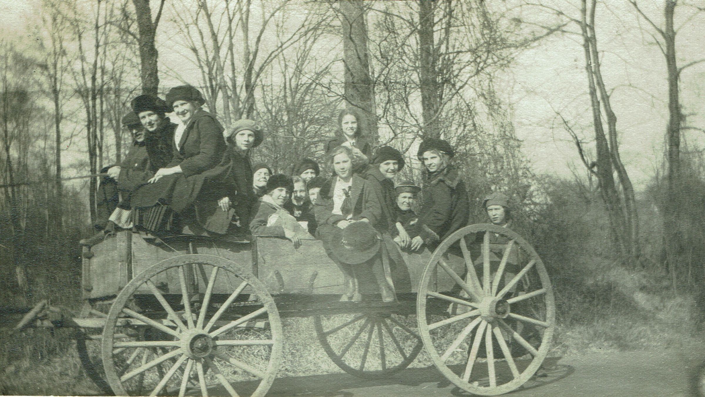 Photograph of Trowbridge Family with Tamakwa Campfire Girls of Arlington, N.J. from February, 1921. Inscription on back of photograph reads: Mrs. Trowbridge's wagon met us at the station in Millburn. Feb. 1921. According to photograph identification letter: Seated on wagon in front: George Trowbridge (Father), Laura Trowbridge (Daughter), Mrs. Noepel (Mrs. Trowbridge's sister) nee Sanford.Acquisition
