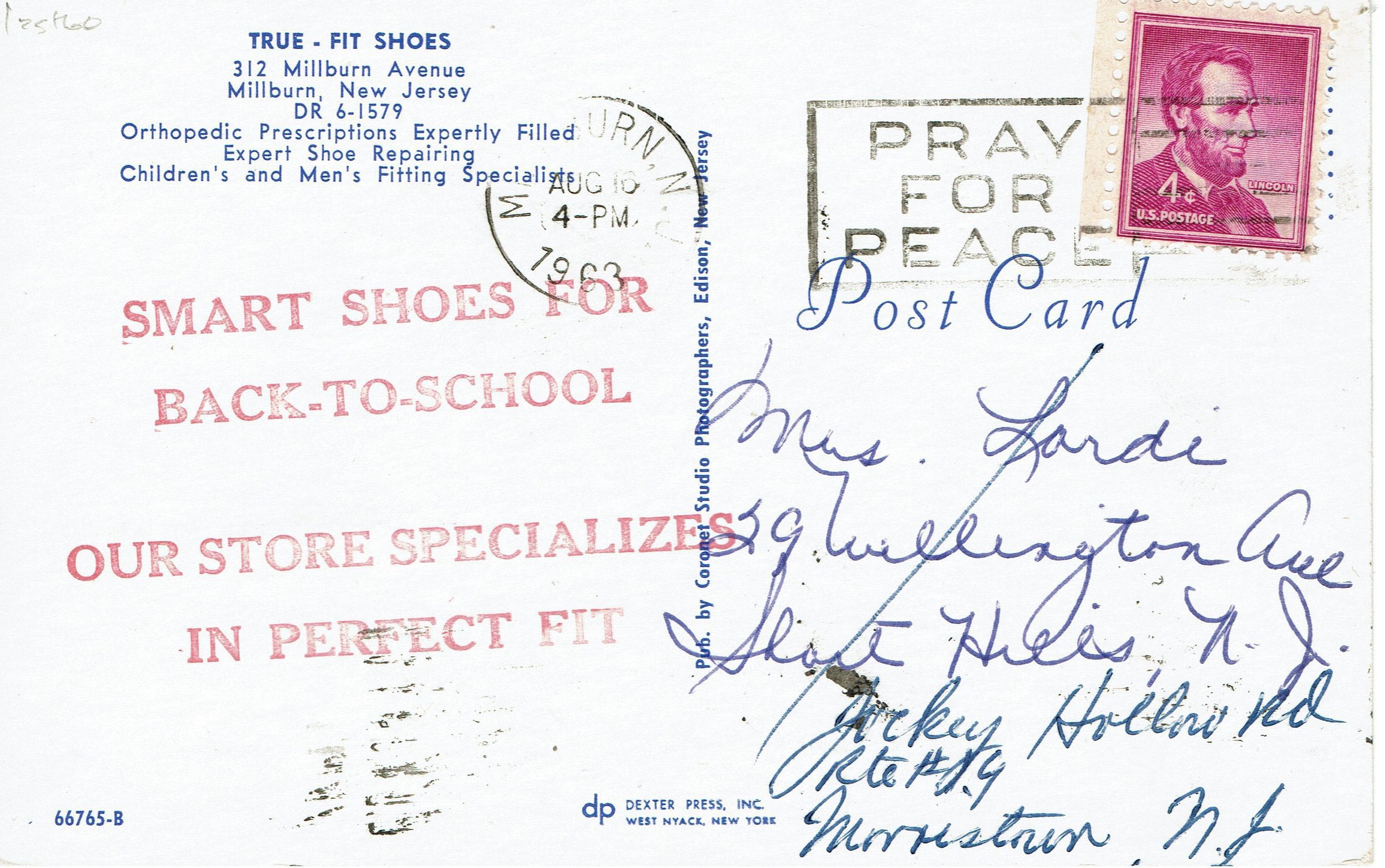 Postally used advertising postcard for True-Fit Shoes, 312 Millburn Avenue, Millburn N.J. Postmarked Millburn, August 16, 1963, 4:00 pm.Collection