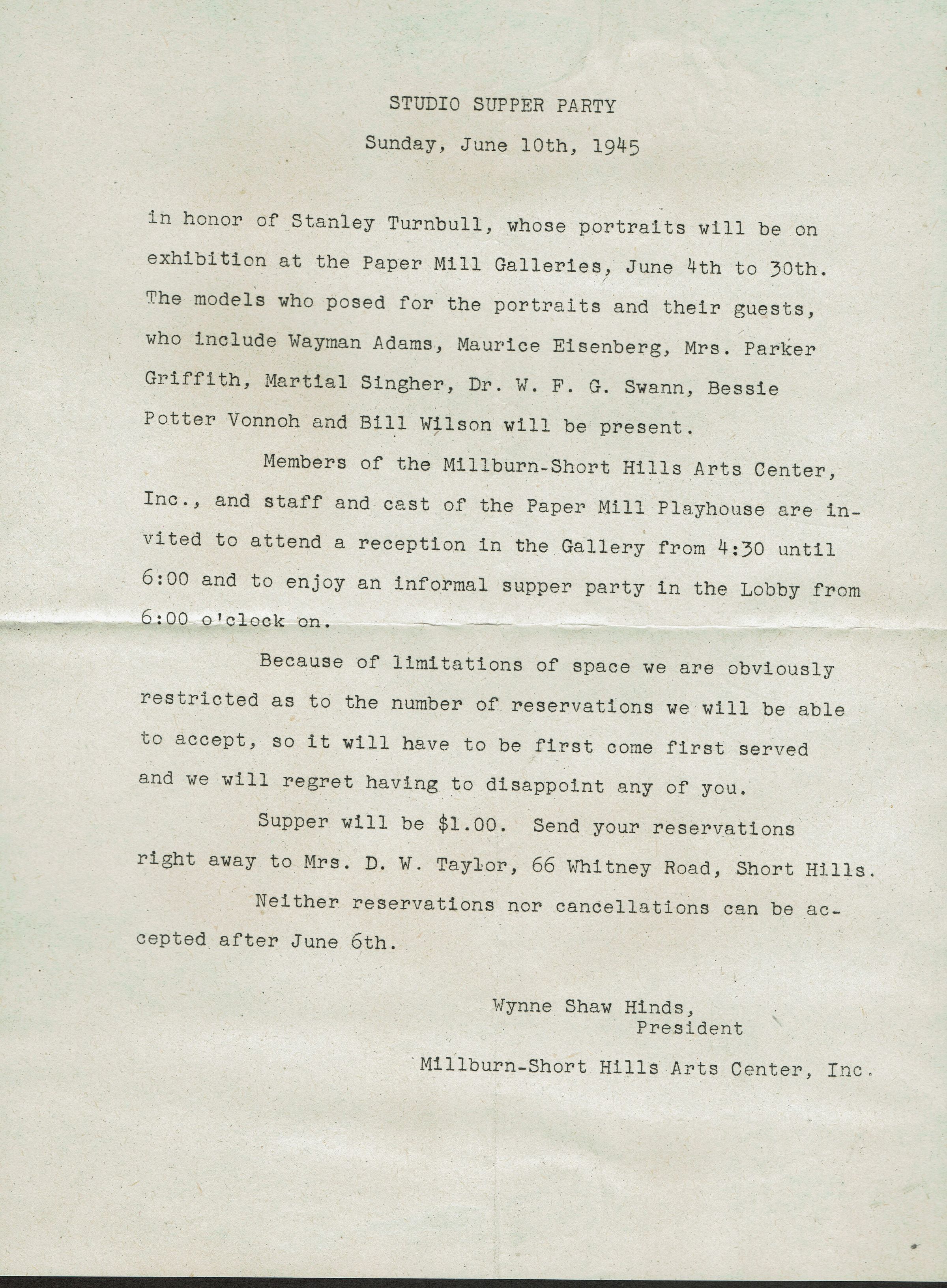 Turnbull: Millburn Art Center Dinner in Honor of Stanley Turnbull, 1945